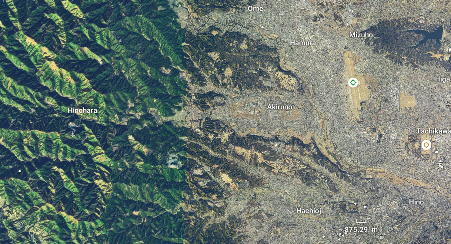 そして都心部だけでなく周辺もフォトグラメトリ生成ベースのリアルな地上風景になったことで、山村集落がカバーエリアに入っていると、