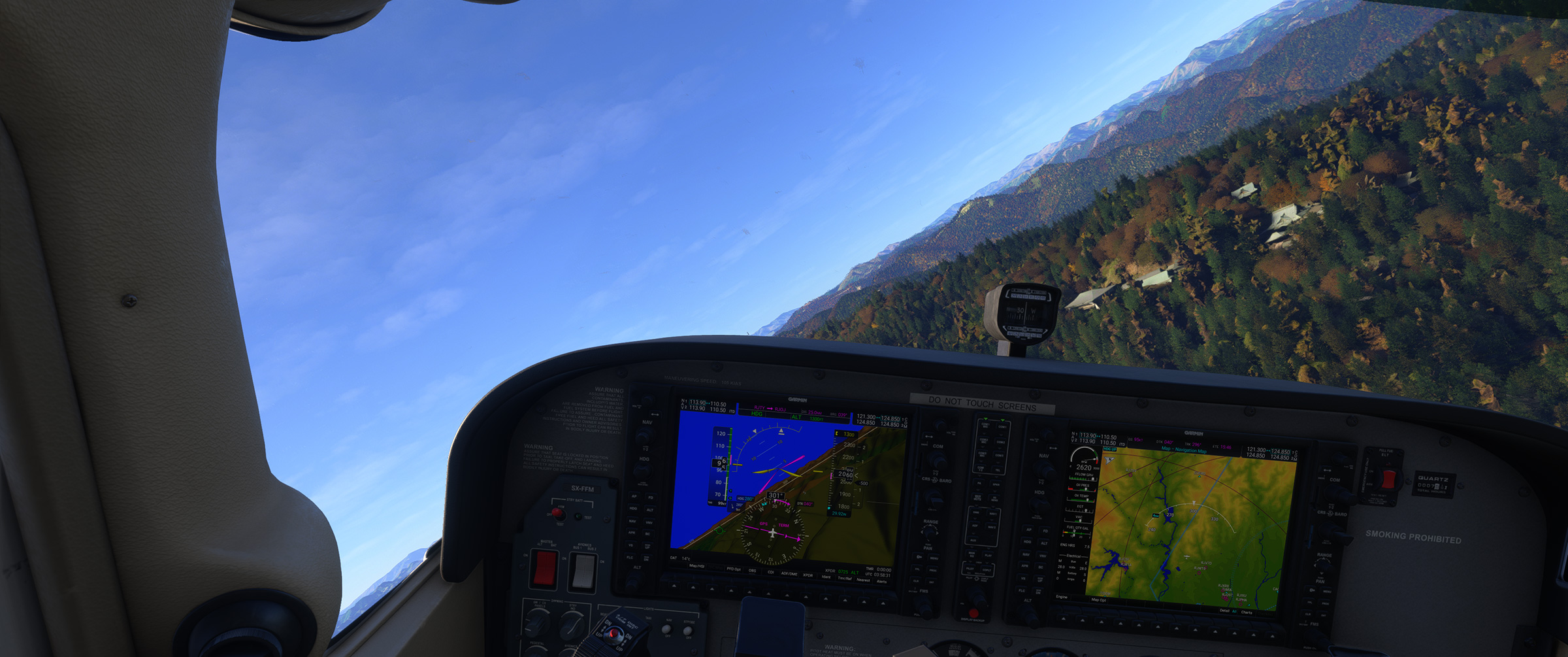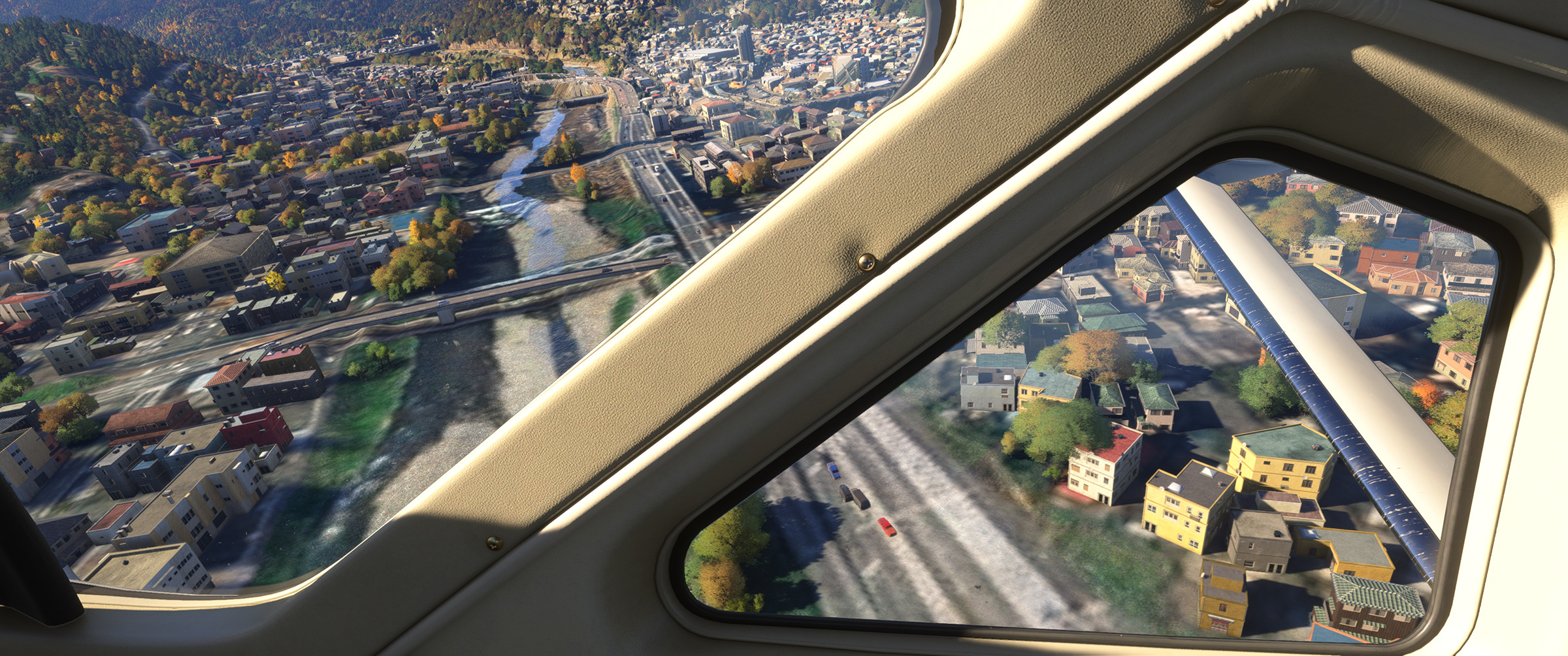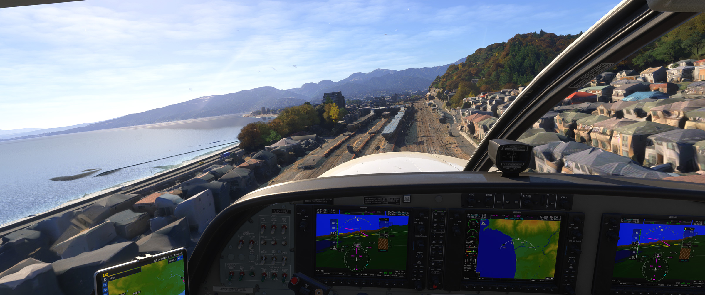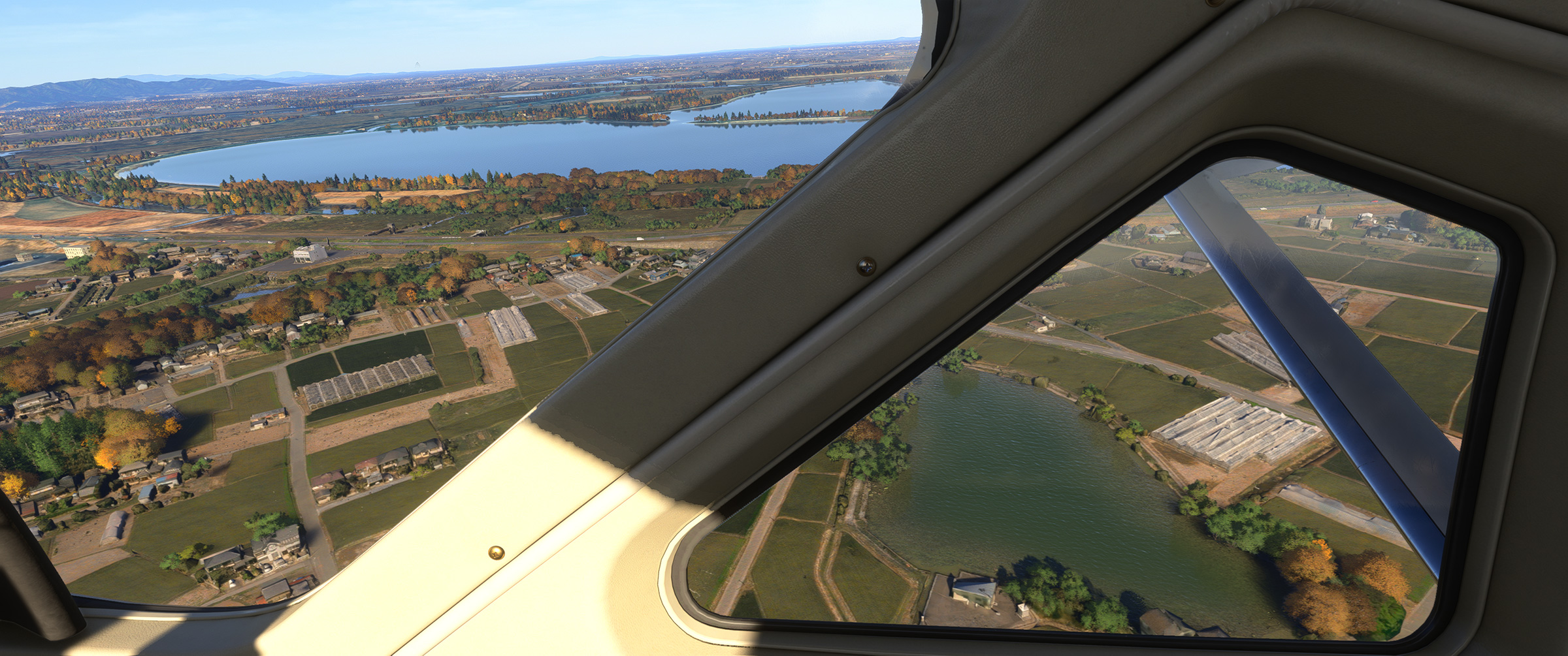 超低空で飛んでいる時の切り取りスクリーンキャプチャ画像では随分と現実より汚く変形して見えますが、実際はそれなりの速度で飛んでいますし、もうちょっと高度を取って飛んでいますから、実際の MSFS プレイ中ではそこそこリアル感があります。