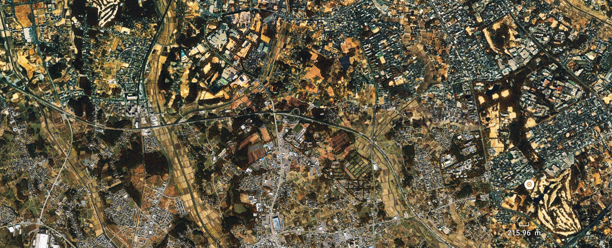 これを見ると龍ヶ崎の西側(藤代駅のあたりなど)で精細感のある航空写真=フォトグラメトリ生成エリアが終わって少々粗めの写真になっていることが判ります。龍ヶ崎の東でまたフォトグラメトリ生成エリアになっているのは成田空港周辺までカバーしているのが影響しているようです。