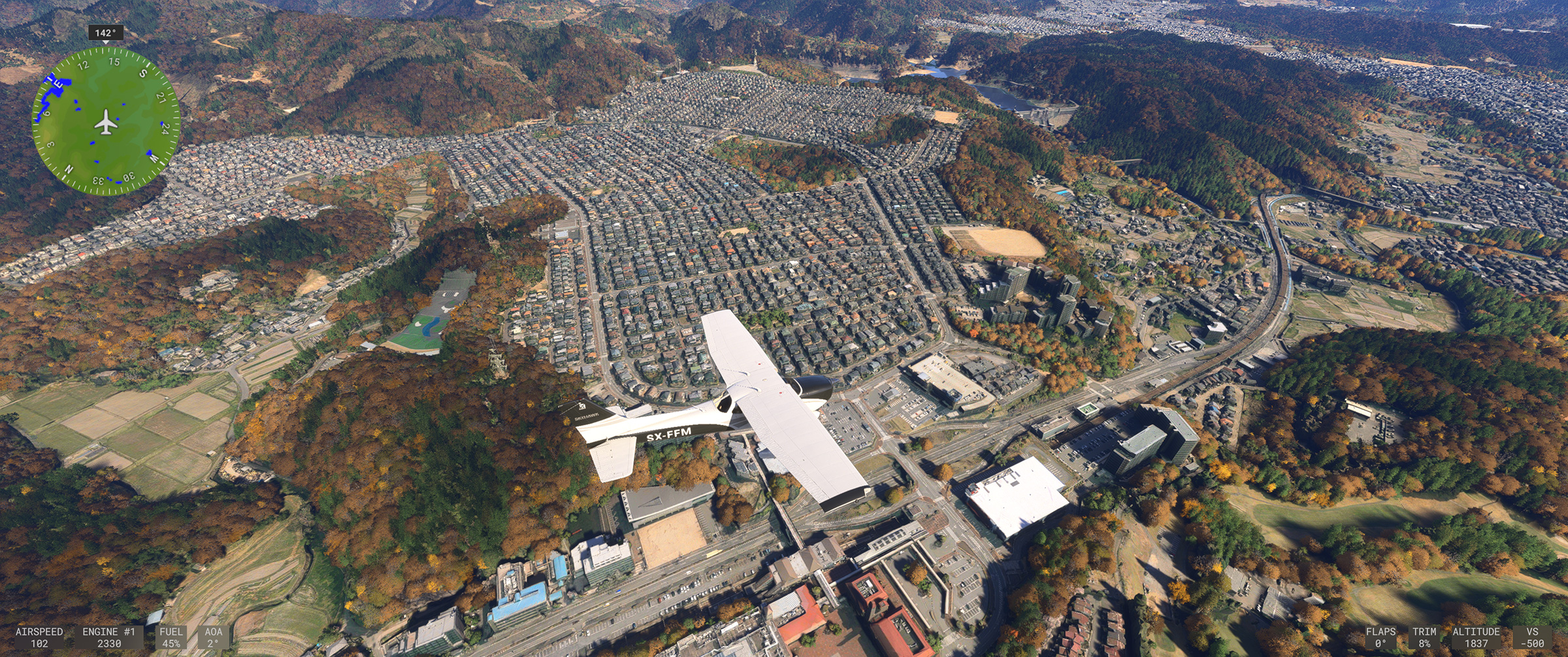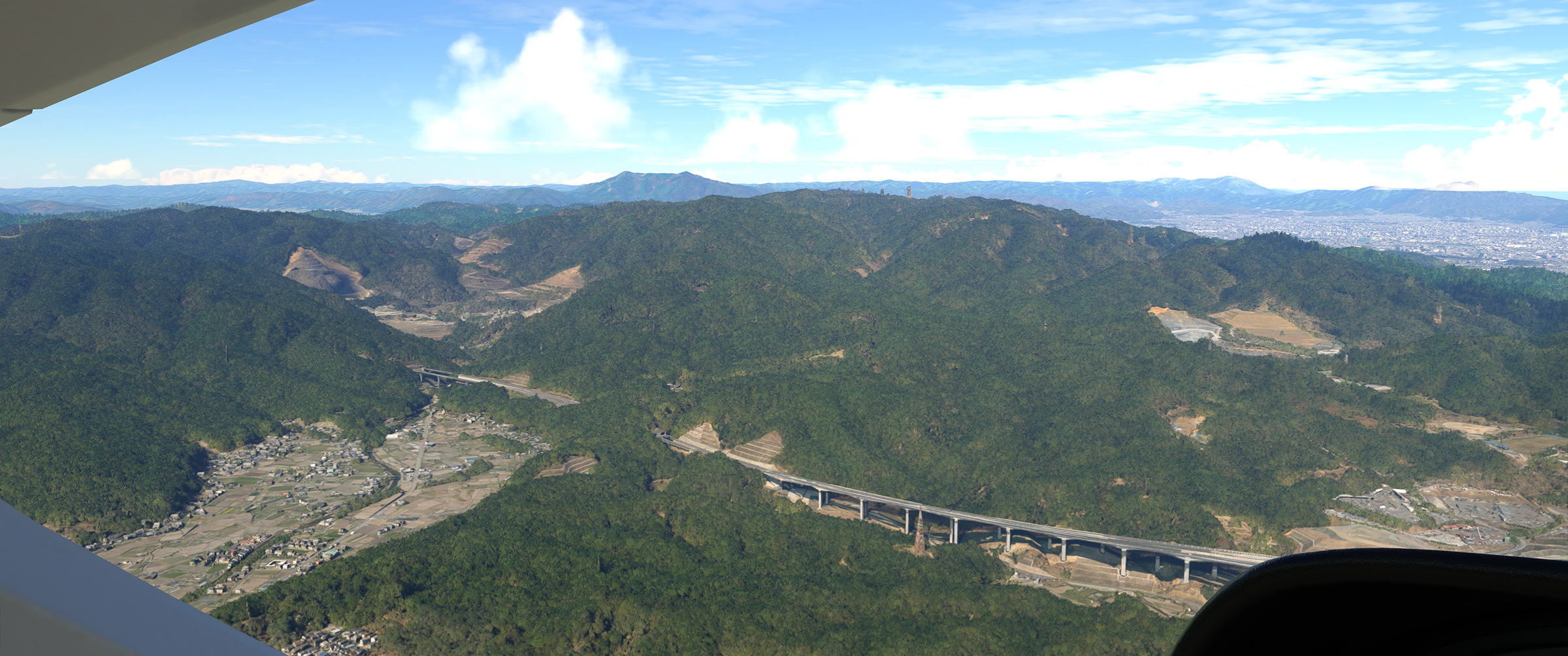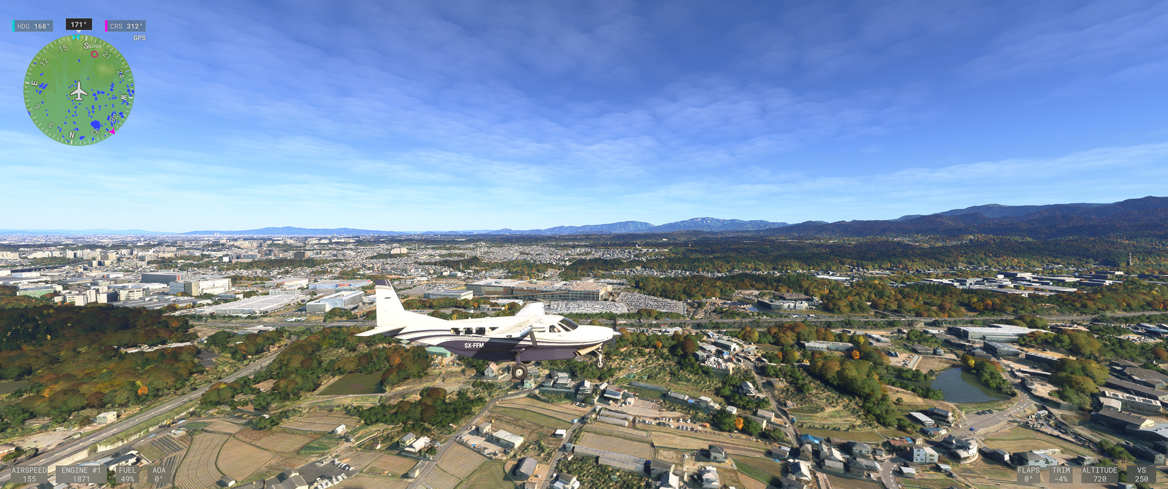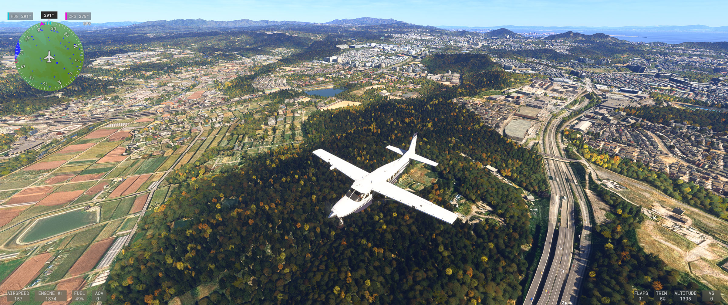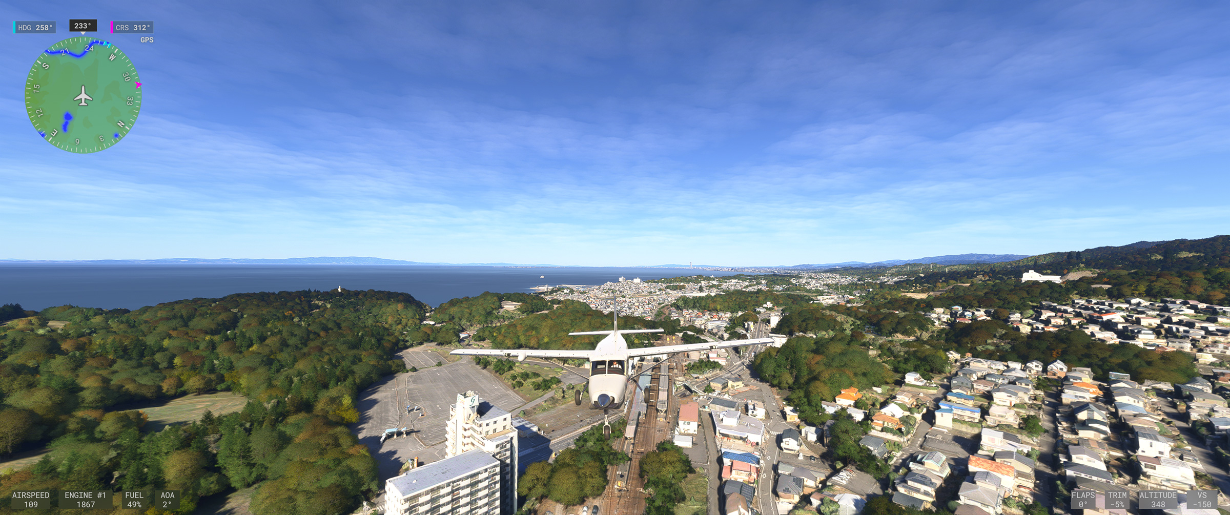 むかし MSFS 2020 購入後、ぶらぶら遊覧飛行していてこの景色を見た時はちょっと驚きましたね。割と昔からある神戸の山の向こうの住宅地で、私も何度か行ったり通ったりしているので、六甲山の向こうに広大な住宅地があるのは判っていましたが、