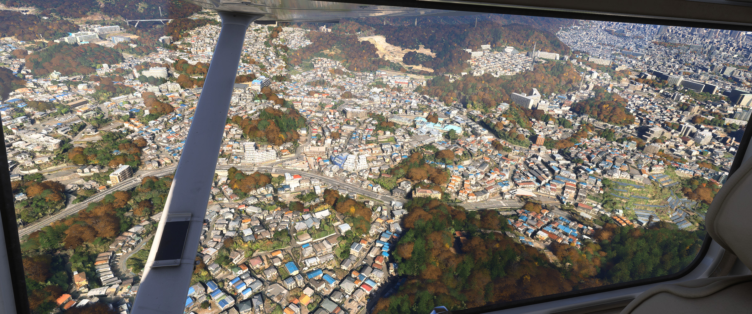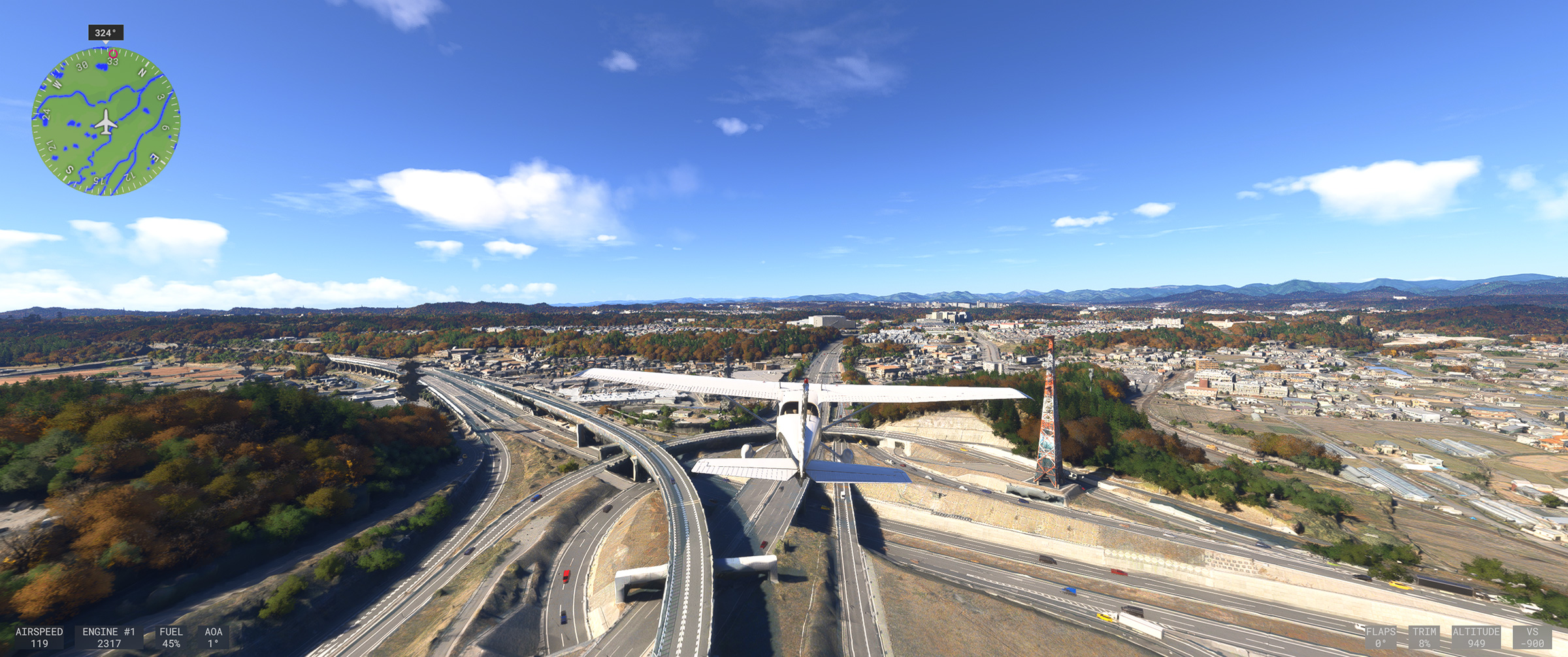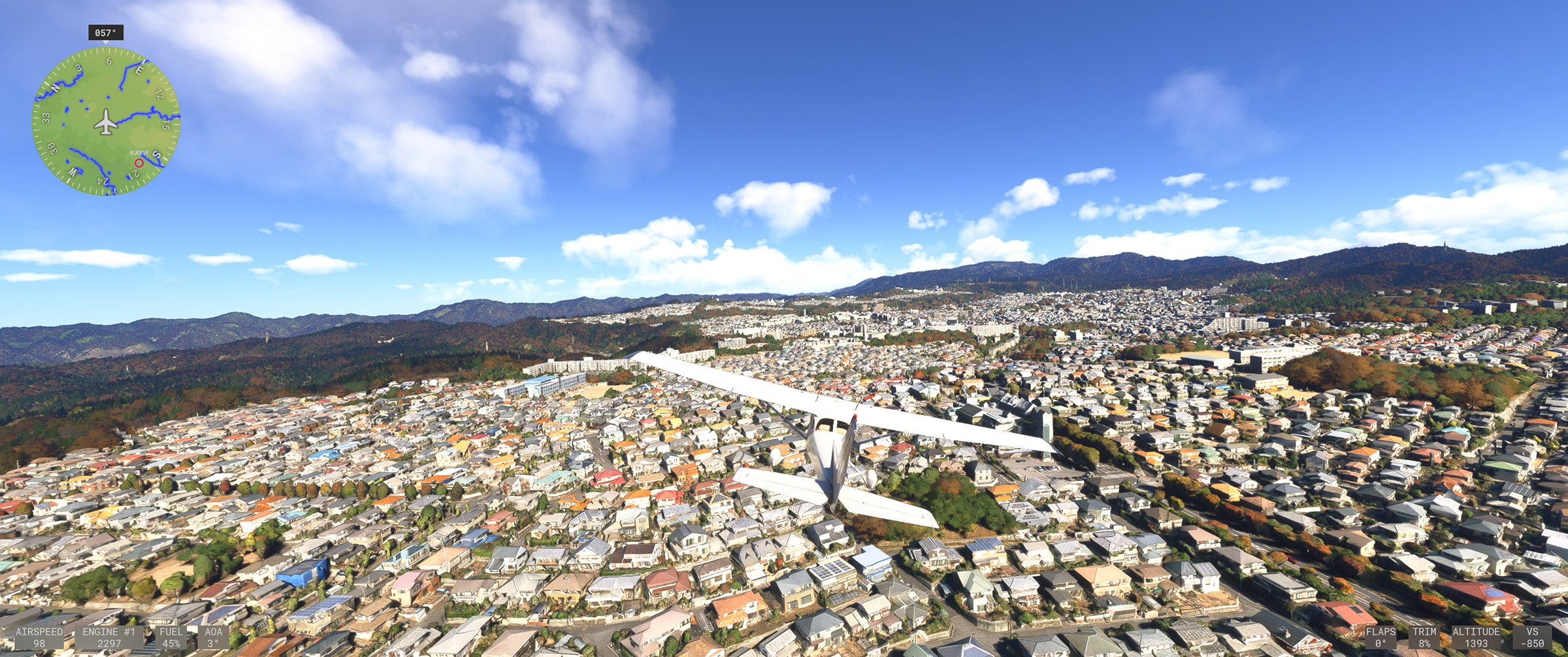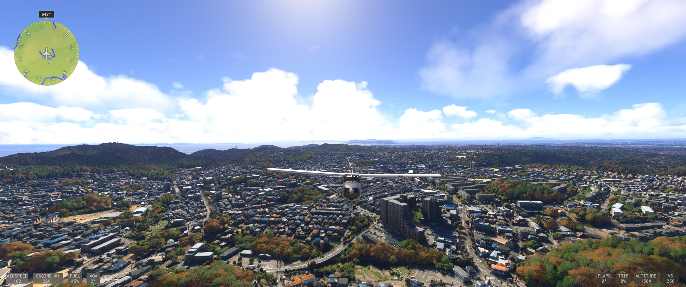 むかし MSFS 2020 購入後、ぶらぶら遊覧飛行していてこの景色を見た時はちょっと驚きましたね。割と昔からある神戸の山の向こうの住宅地で、私も何度か行ったり通ったりしているので、六甲山の向こうに広大な住宅地があるのは判っていましたが、