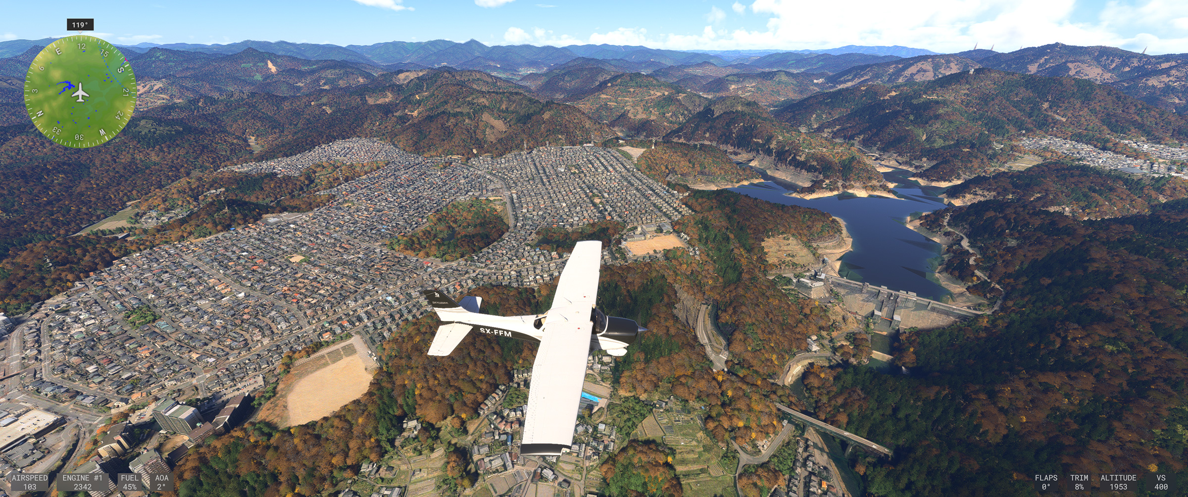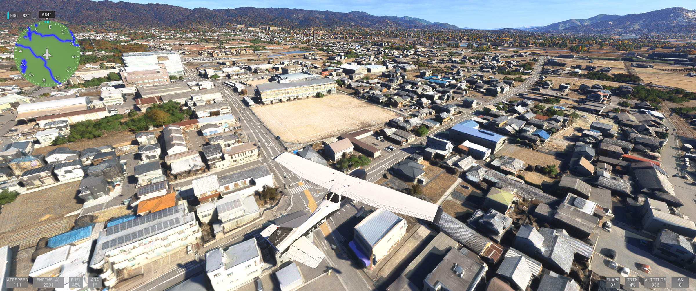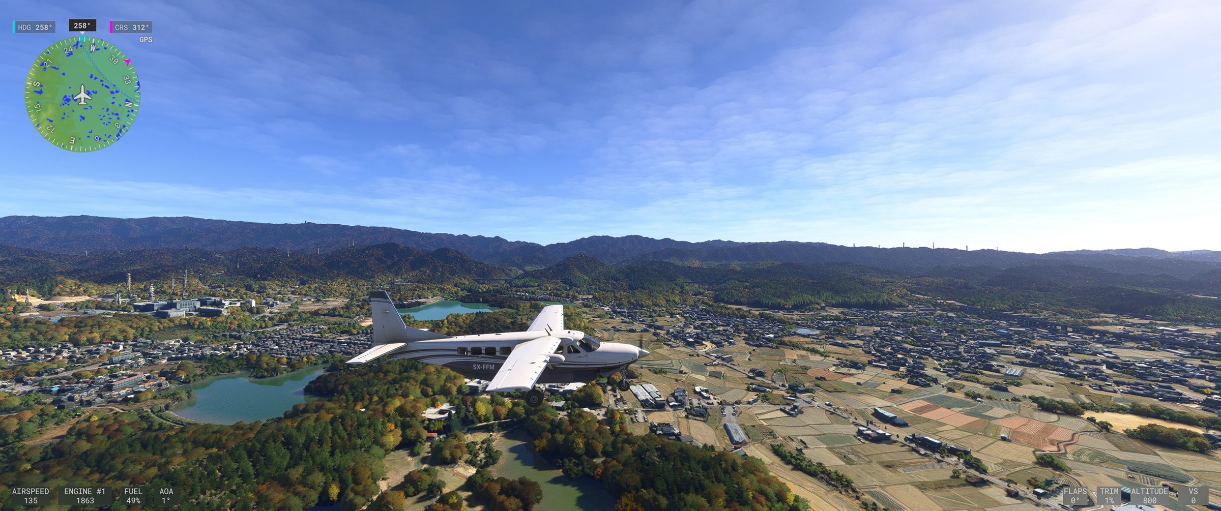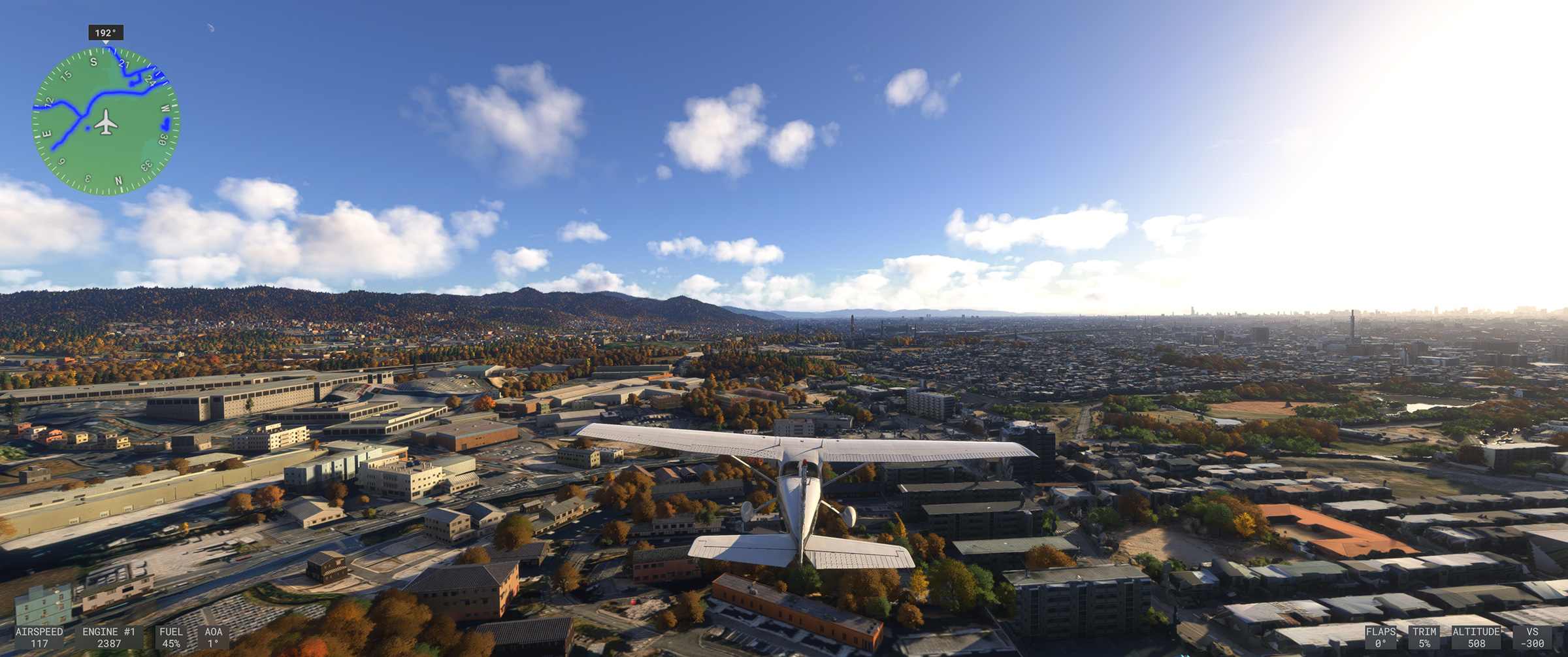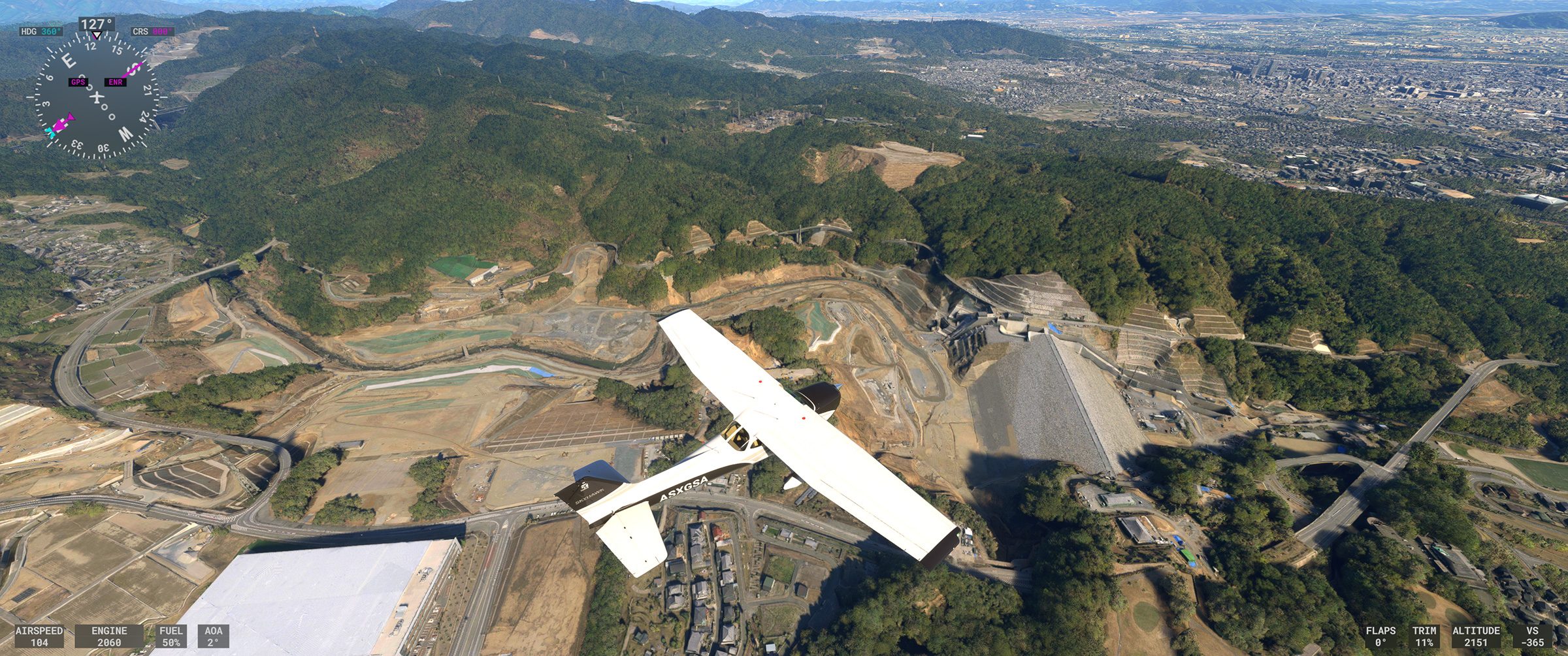 むかし MSFS 2020 購入後、ぶらぶら遊覧飛行していてこの景色を見た時はちょっと驚きましたね。割と昔からある神戸の山の向こうの住宅地で、私も何度か行ったり通ったりしているので、六甲山の向こうに広大な住宅地があるのは判っていましたが、