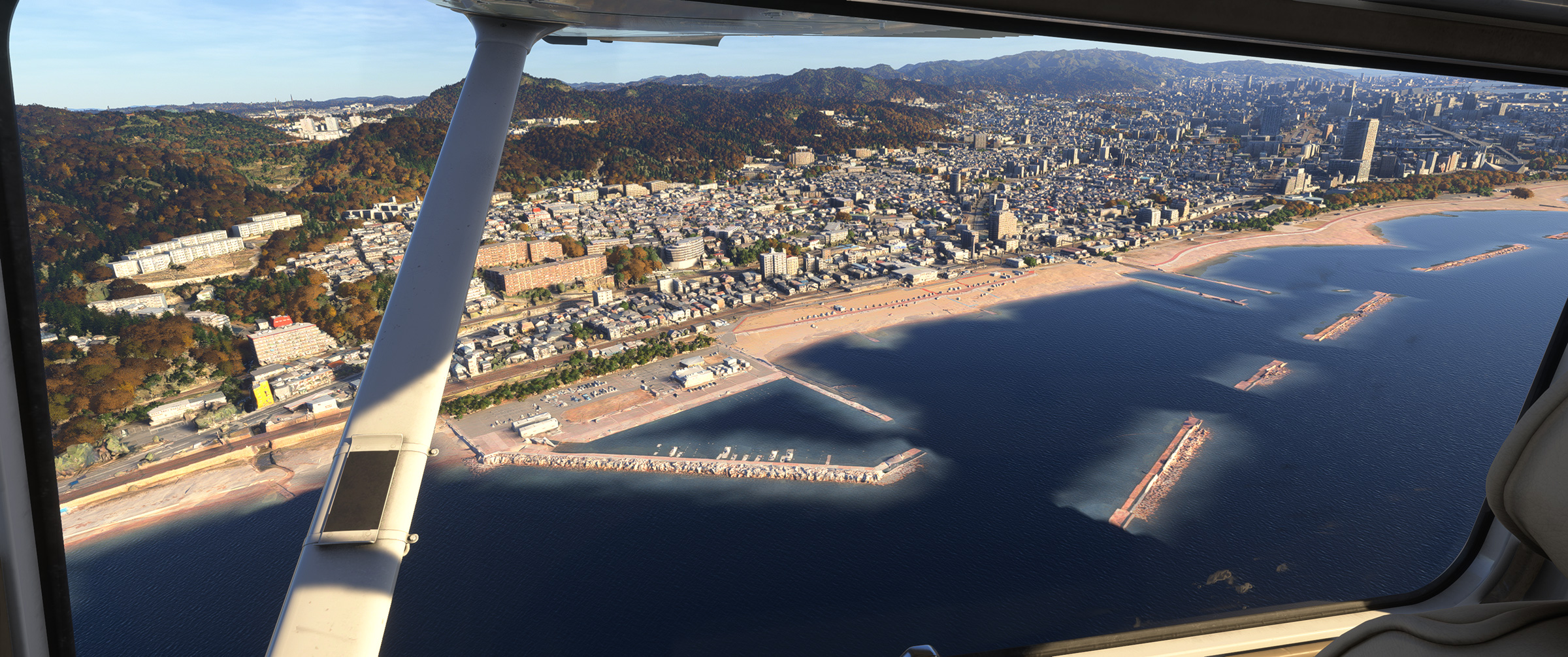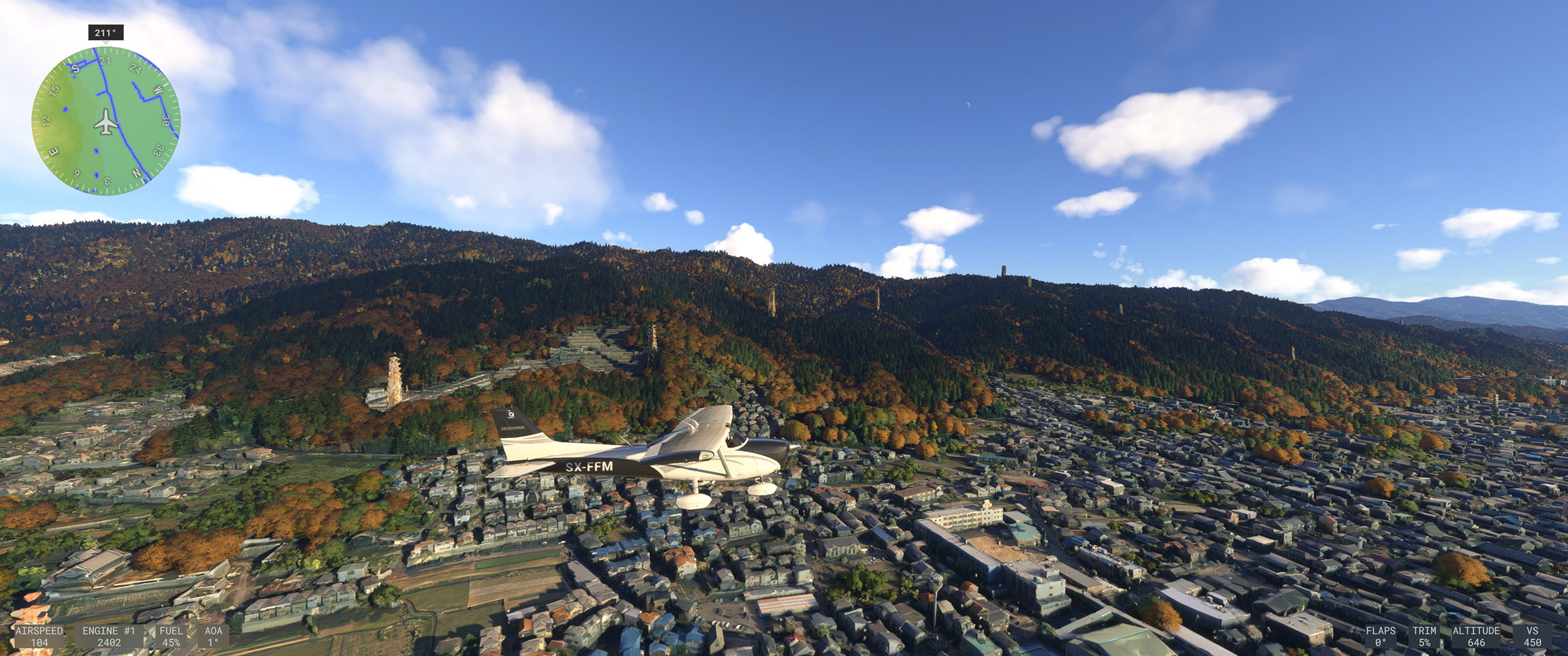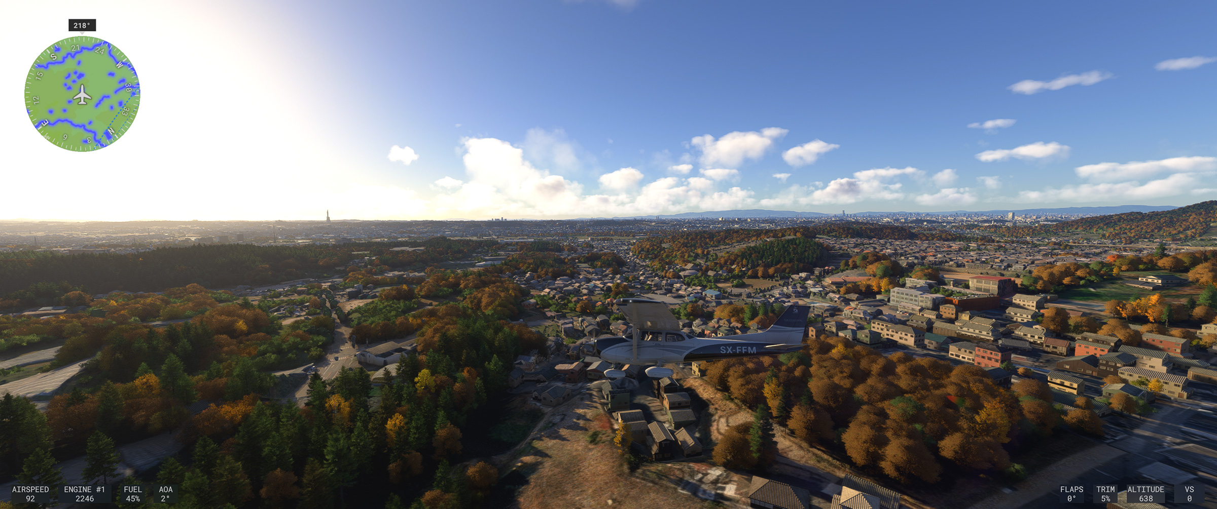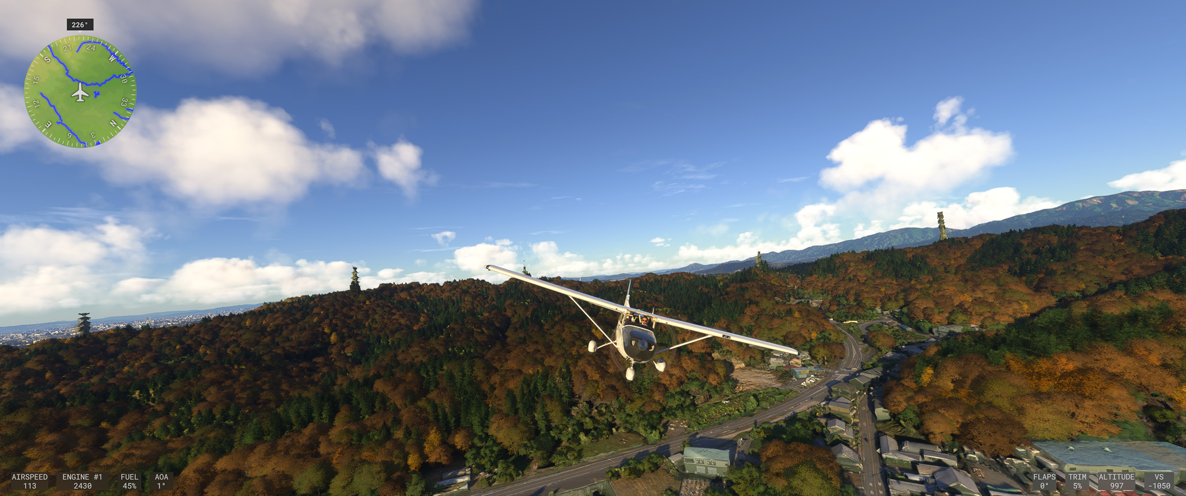 むかし MSFS 2020 購入後、ぶらぶら遊覧飛行していてこの景色を見た時はちょっと驚きましたね。割と昔からある神戸の山の向こうの住宅地で、私も何度か行ったり通ったりしているので、六甲山の向こうに広大な住宅地があるのは判っていましたが、