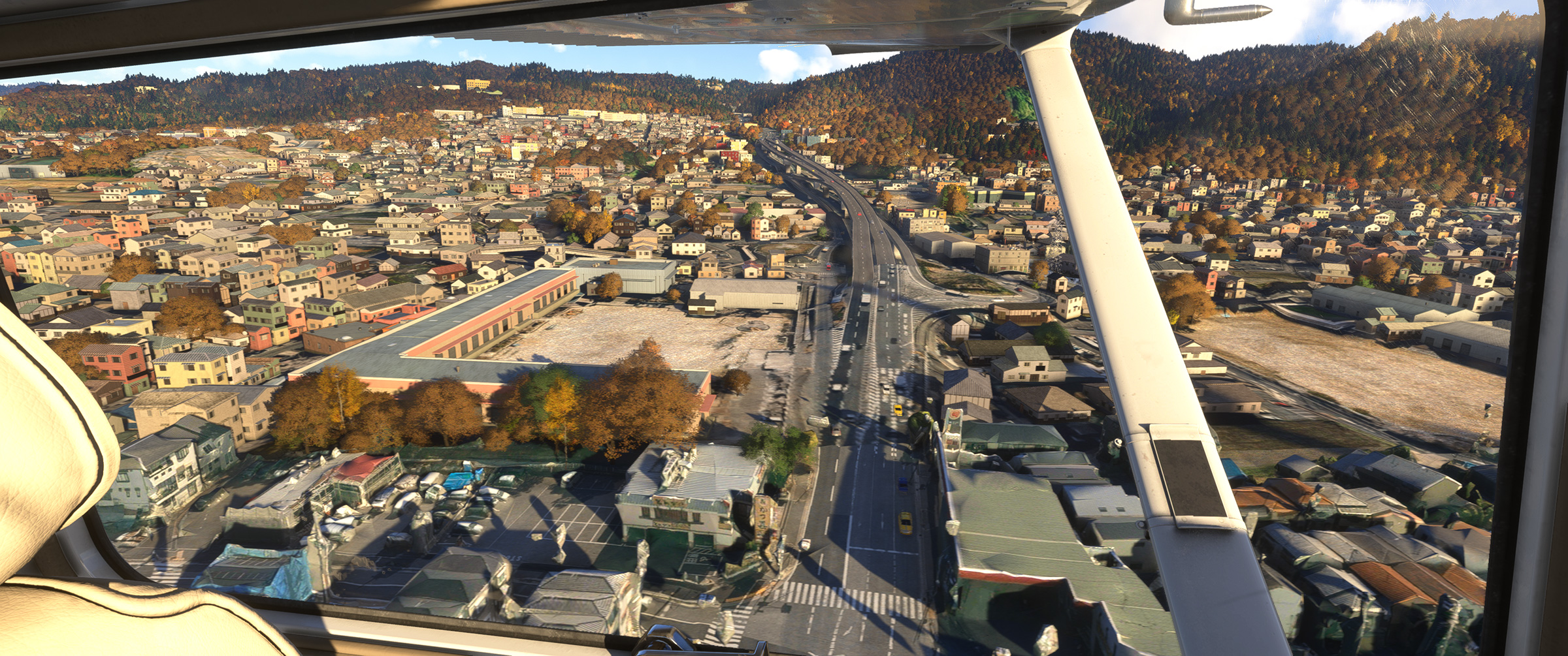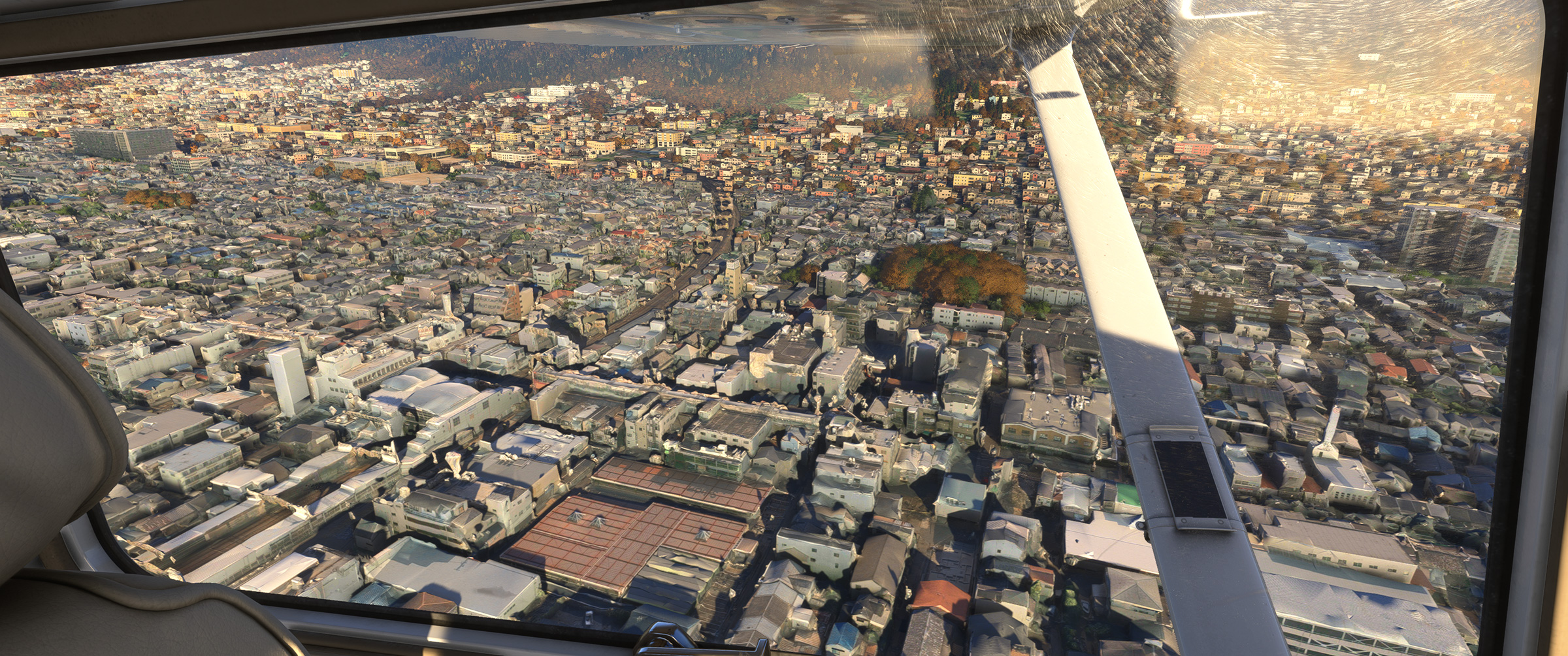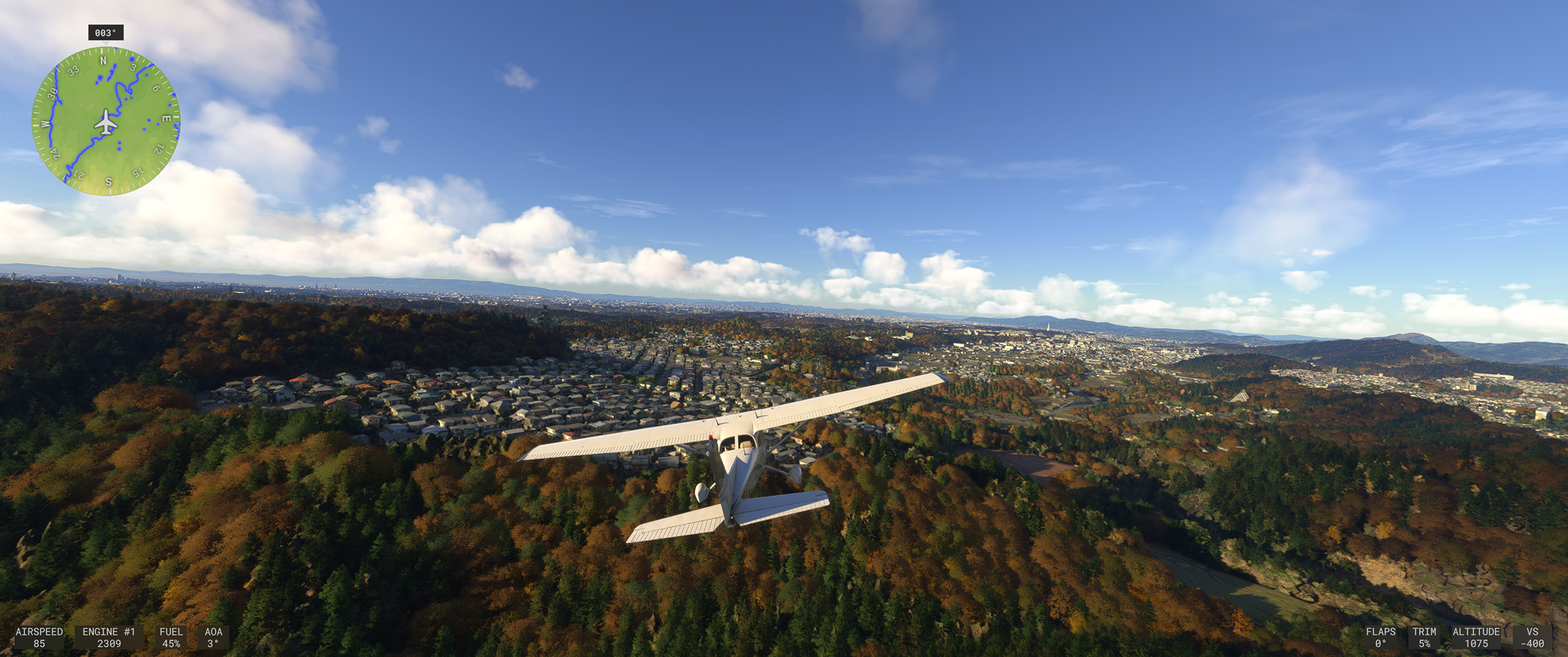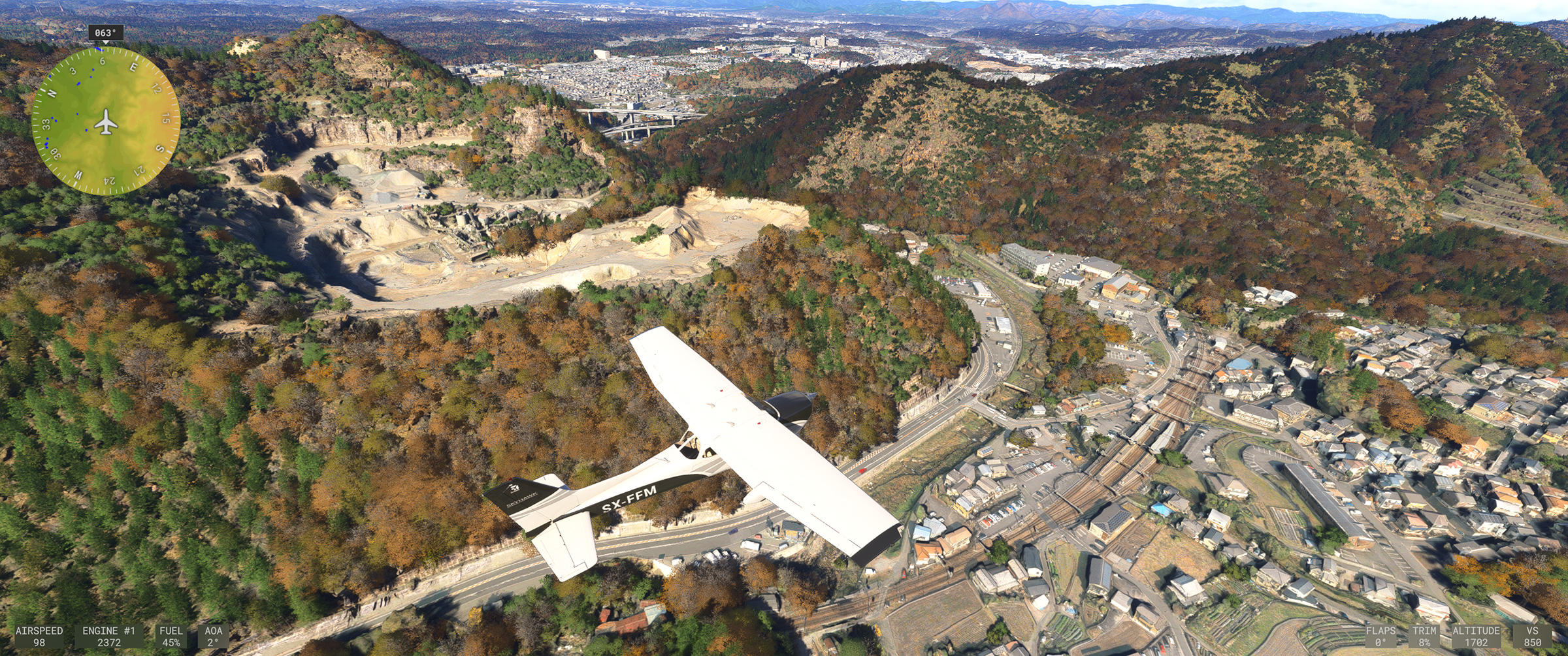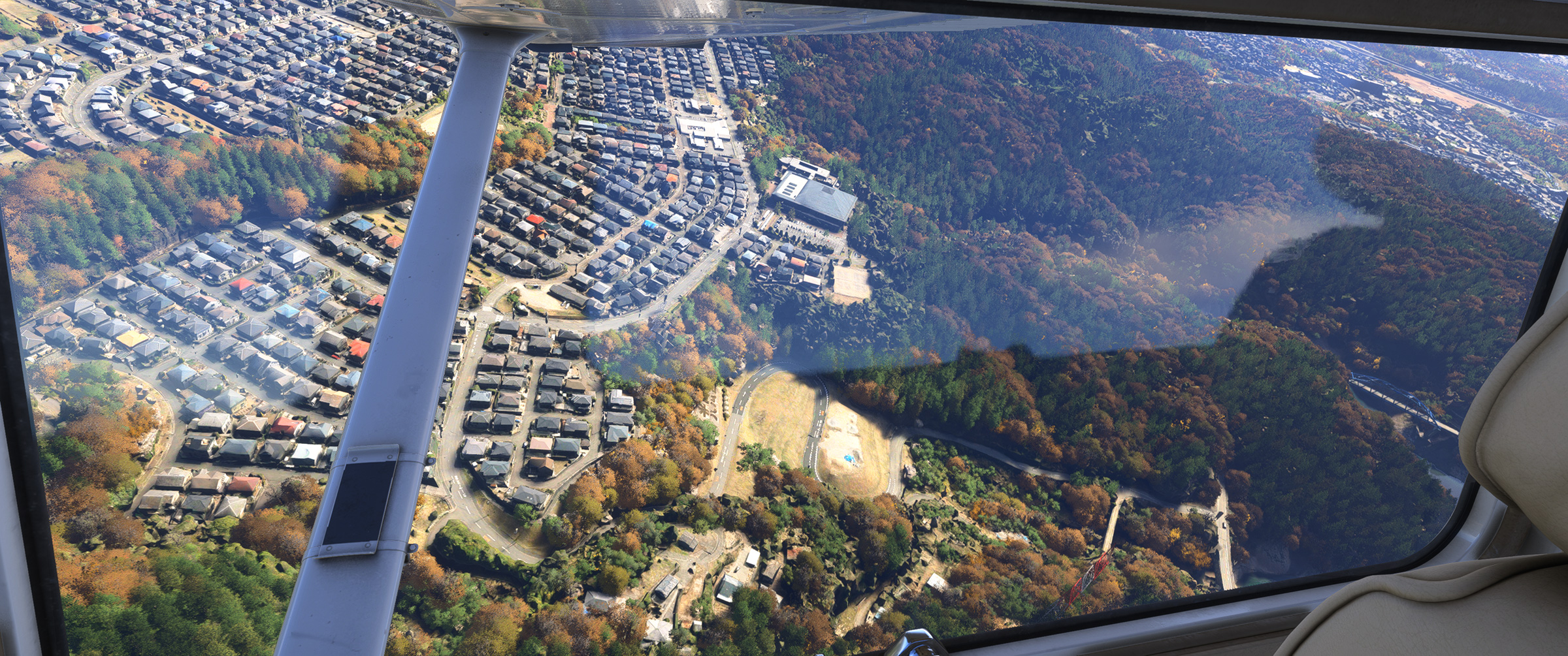 むかし MSFS 2020 購入後、ぶらぶら遊覧飛行していてこの景色を見た時はちょっと驚きましたね。割と昔からある神戸の山の向こうの住宅地で、私も何度か行ったり通ったりしているので、六甲山の向こうに広大な住宅地があるのは判っていましたが、