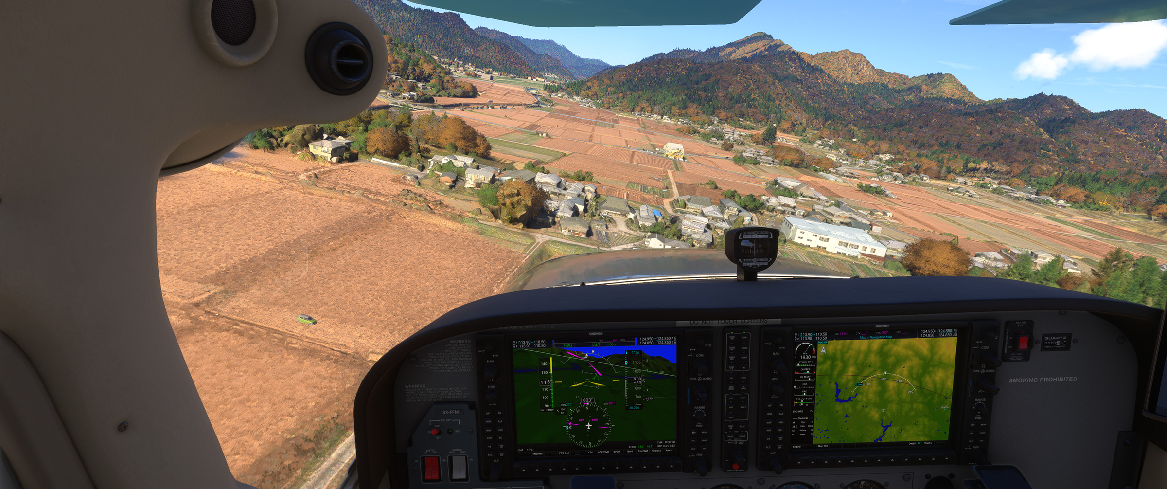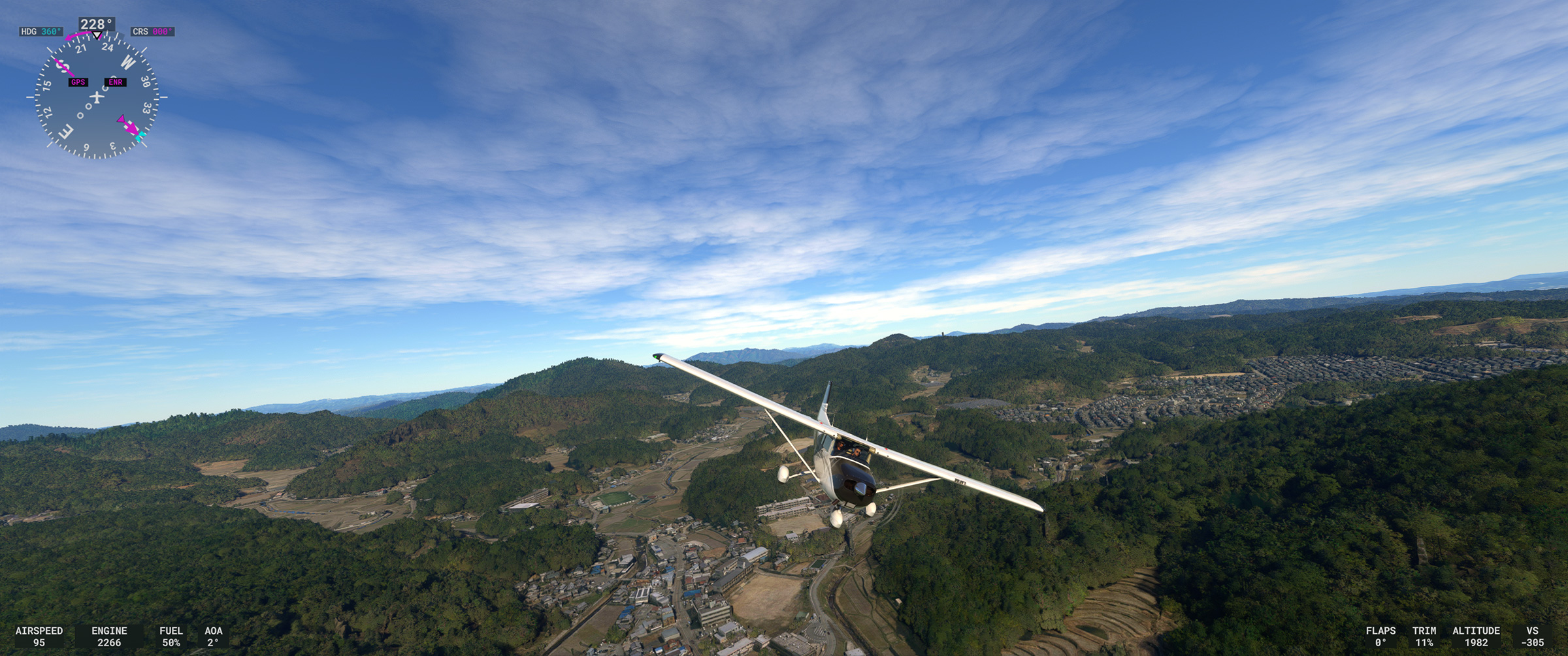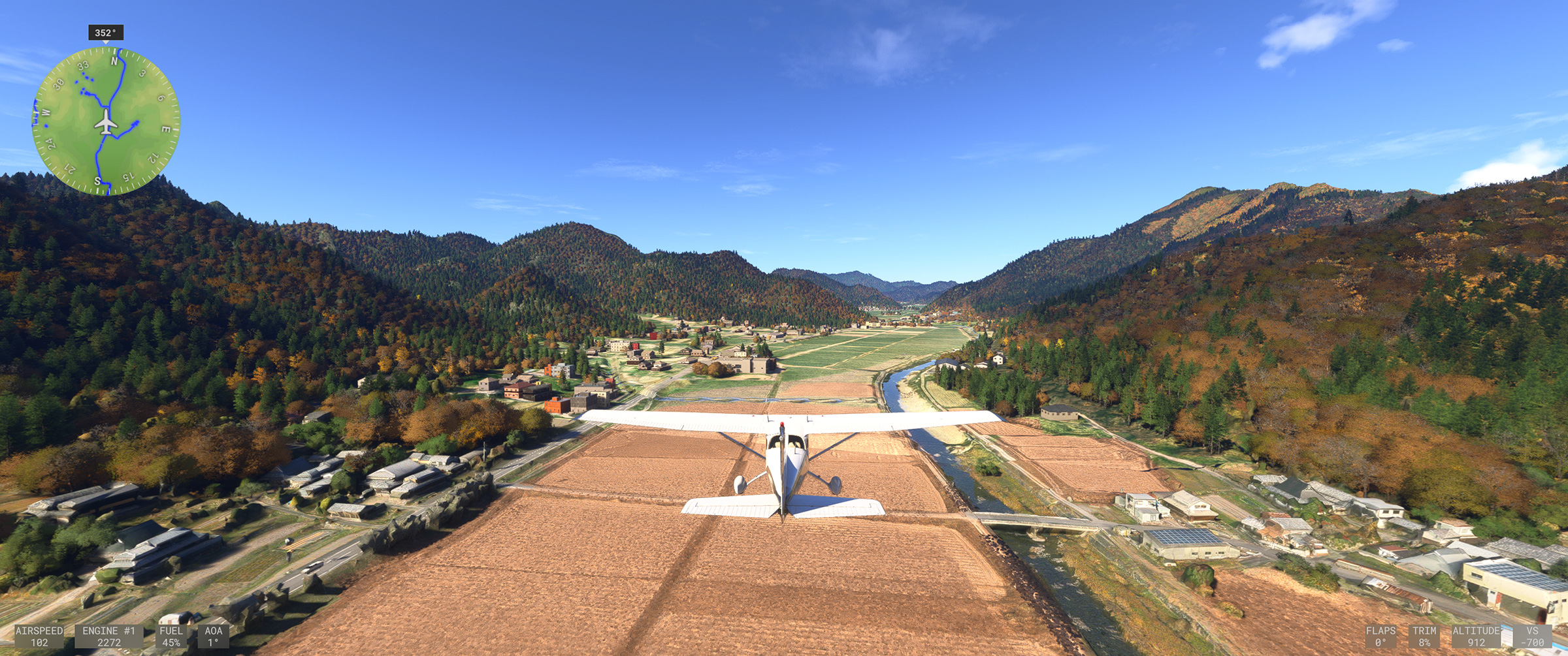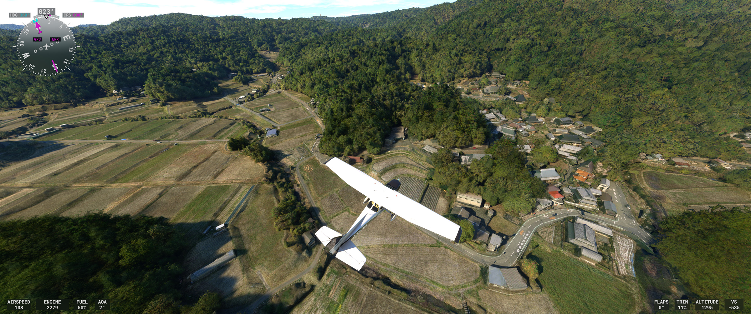 あのさあ、紀ノ川沿いの平野が続くエリアなのに、こんな樹林帯な訳ないじゃん。田んぼの中に一般家屋が点在する日本の田舎の代表的な景色が続くのに、こういうのを出されると飛んでいても萎えるんですよねぇ。と MSFS に向かって独り言を発してしまうパターン。