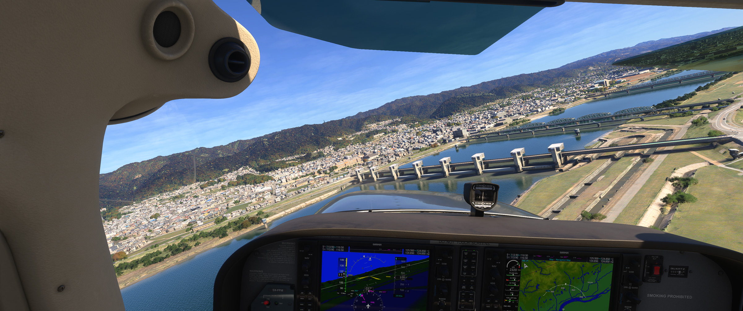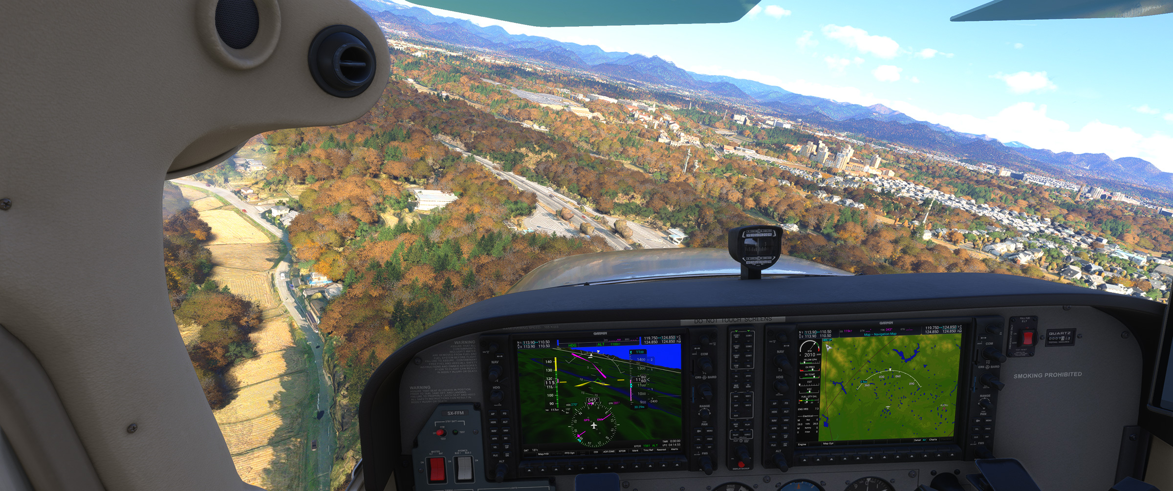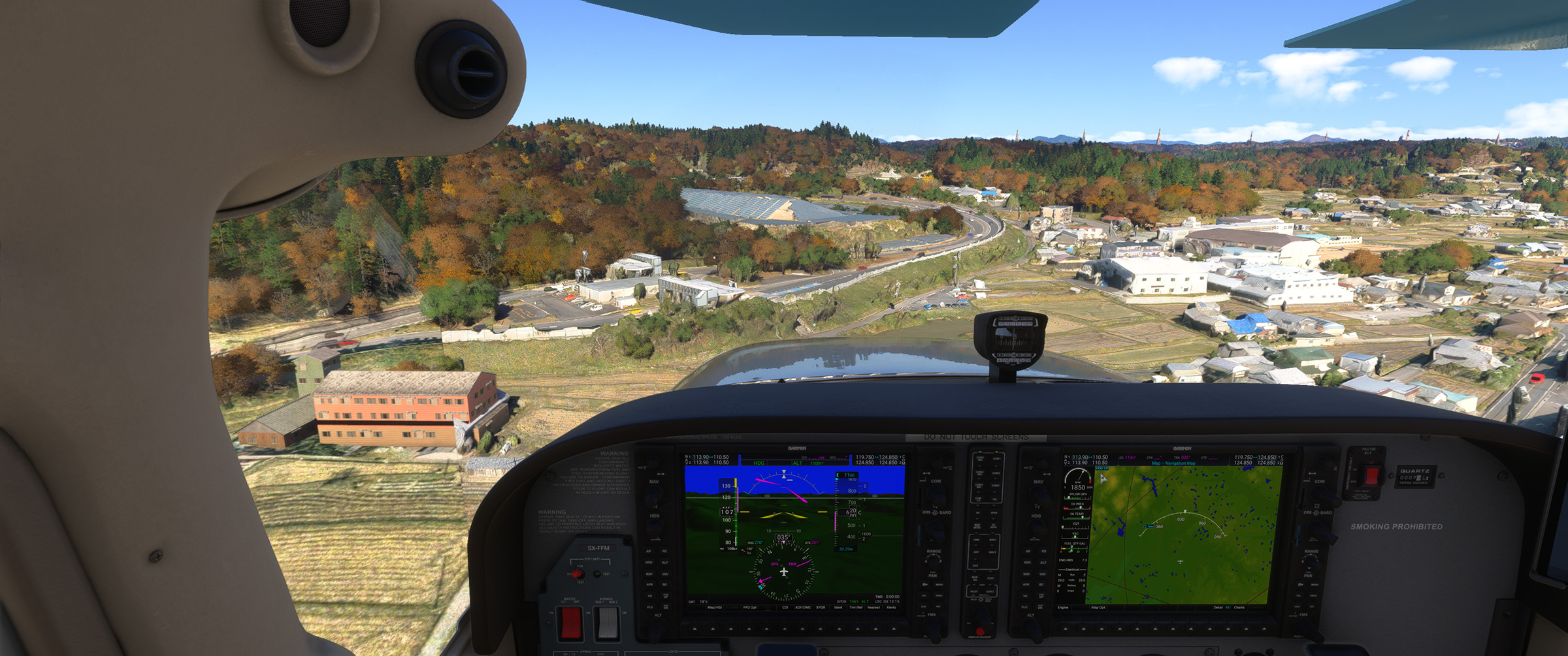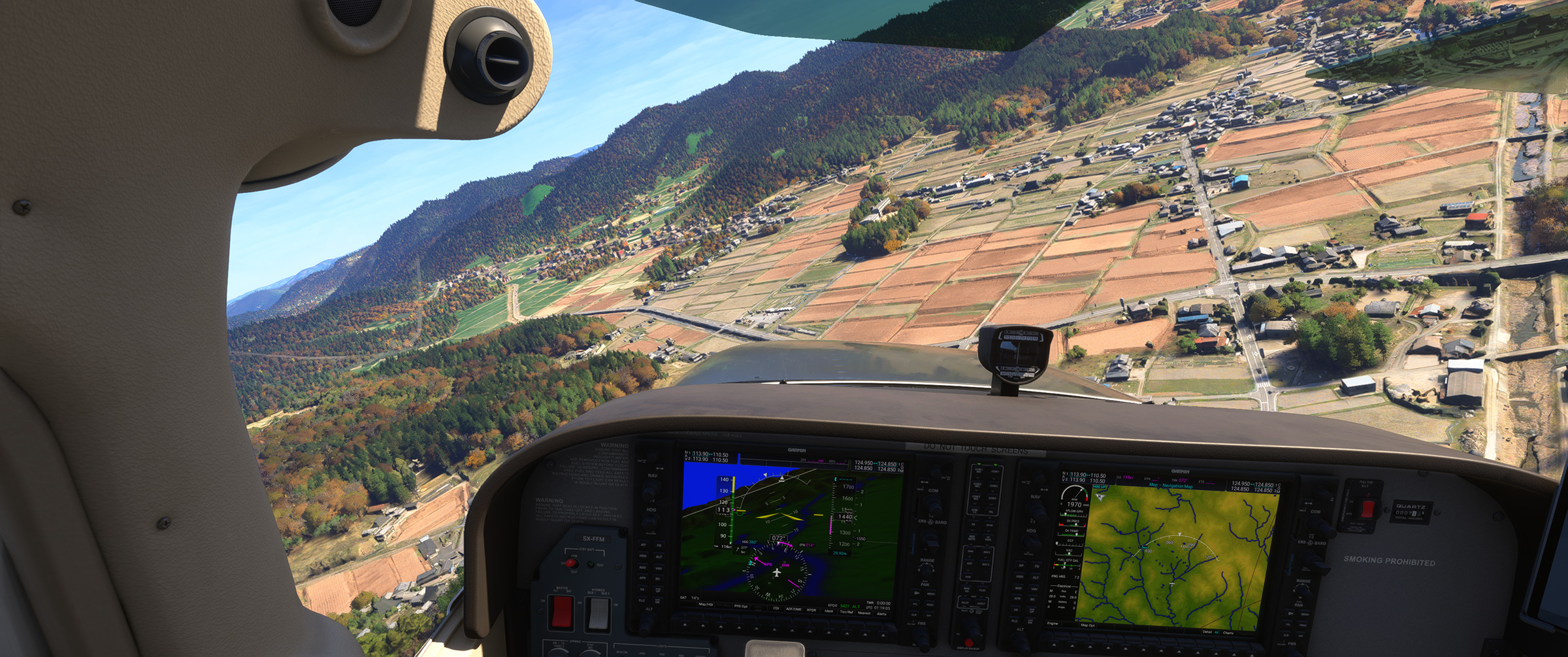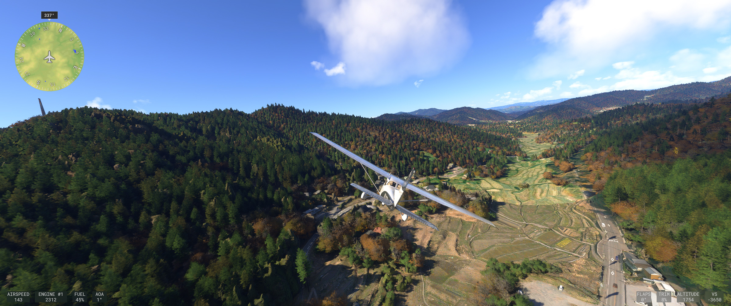 あのさあ、紀ノ川沿いの平野が続くエリアなのに、こんな樹林帯な訳ないじゃん。田んぼの中に一般家屋が点在する日本の田舎の代表的な景色が続くのに、こういうのを出されると飛んでいても萎えるんですよねぇ。と MSFS に向かって独り言を発してしまうパターン。