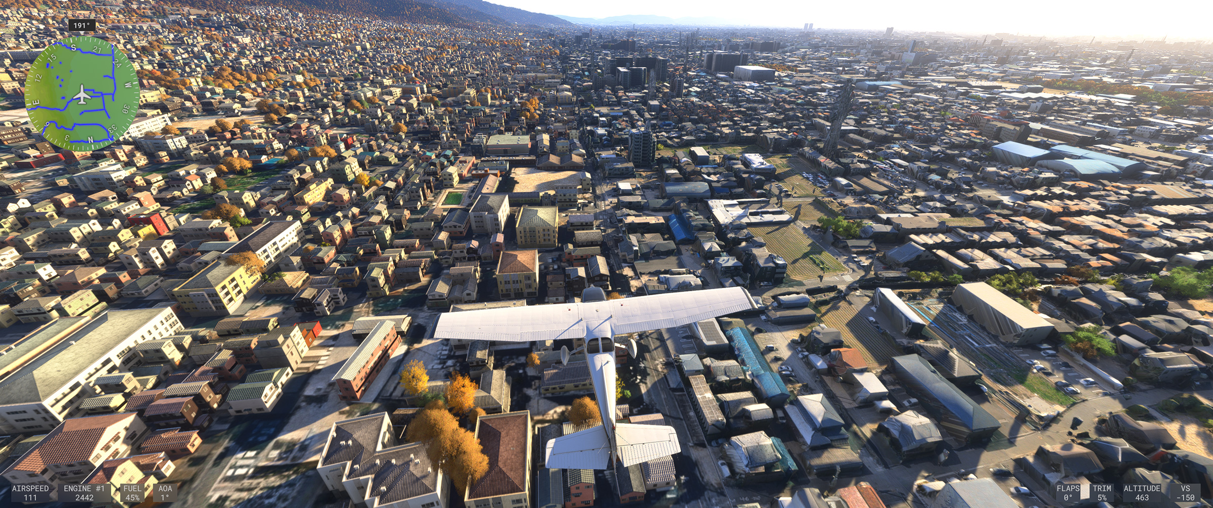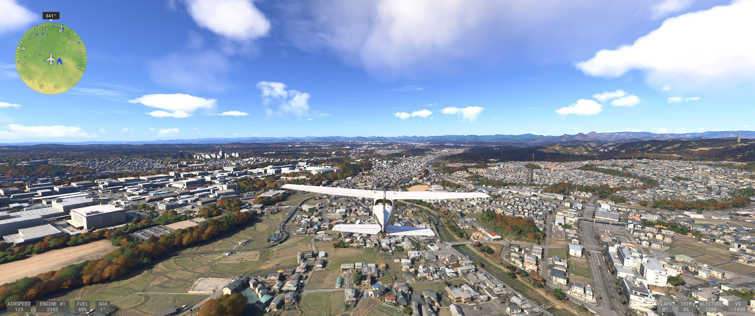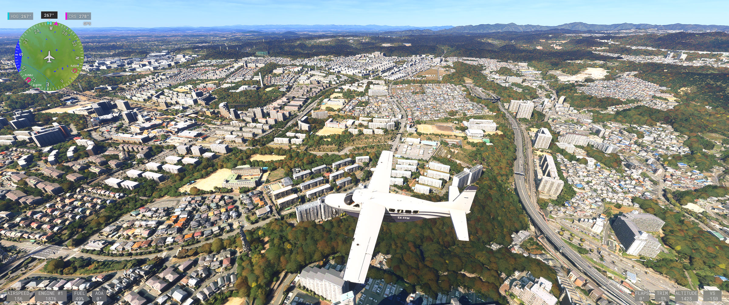 東京や京阪神はかなり周辺部まで、そのフォトグラメトリ手法によって生成されたデーターに基づいて表現された地上風景エリア(以下フォトグラメトリ生成エリア)が広がったことで、上空から見渡しても現実と同じような地上表現になり、飛んでいる時の没入感が圧倒的に増しました。