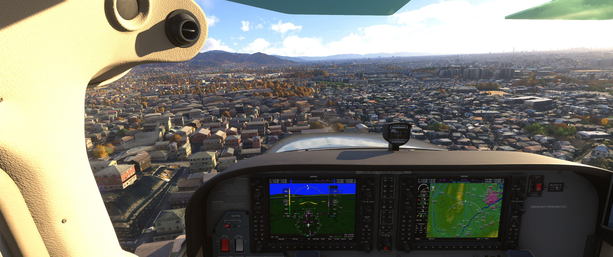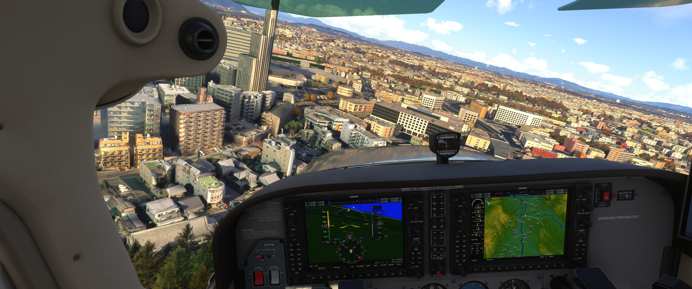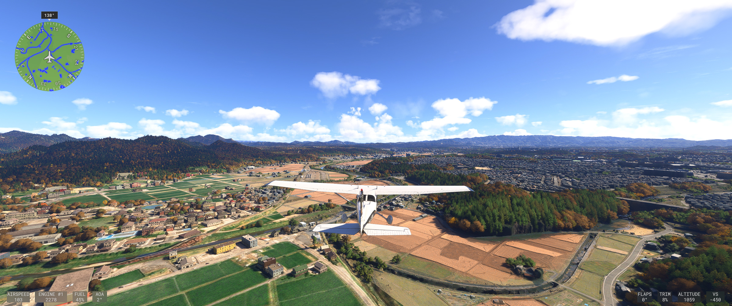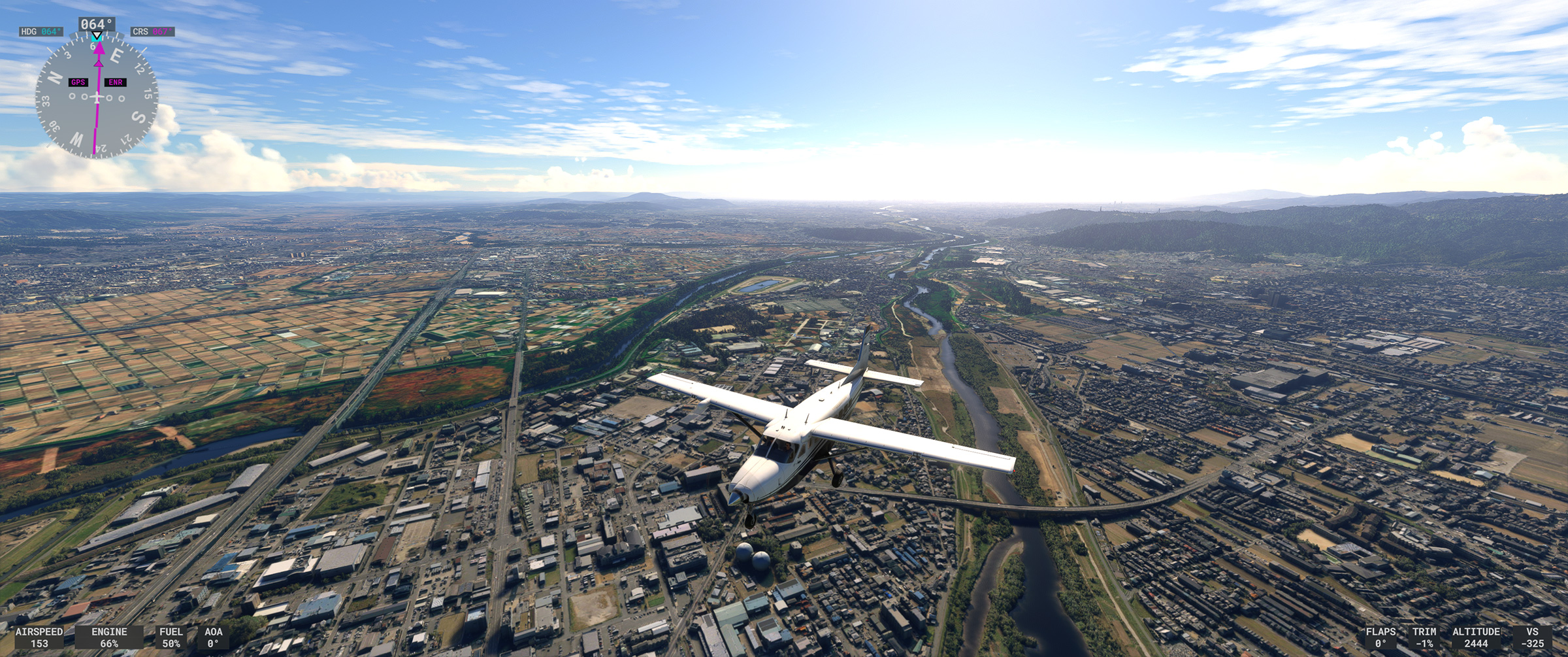 東京や京阪神はかなり周辺部まで、そのフォトグラメトリ手法によって生成されたデーターに基づいて表現された地上風景エリア(以下フォトグラメトリ生成エリア)が広がったことで、上空から見渡しても現実と同じような地上表現になり、飛んでいる時の没入感が圧倒的に増しました。