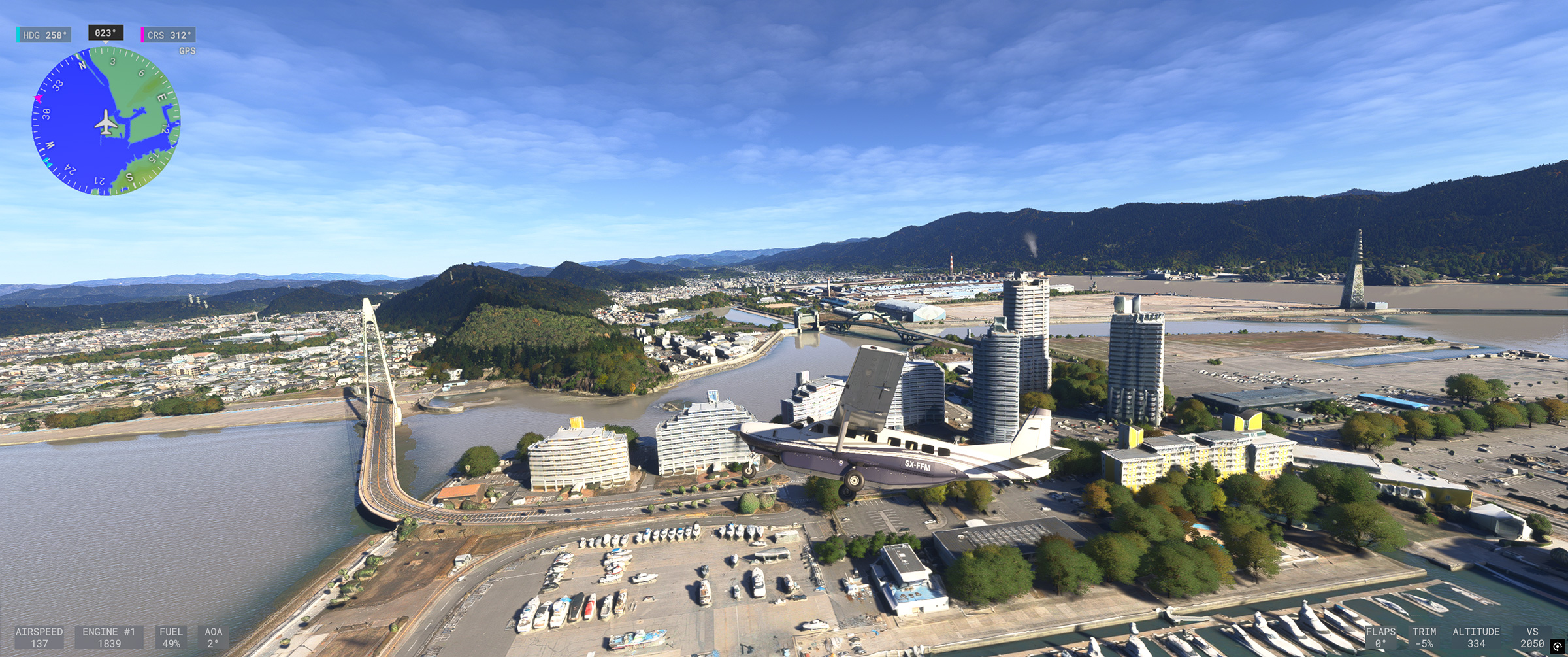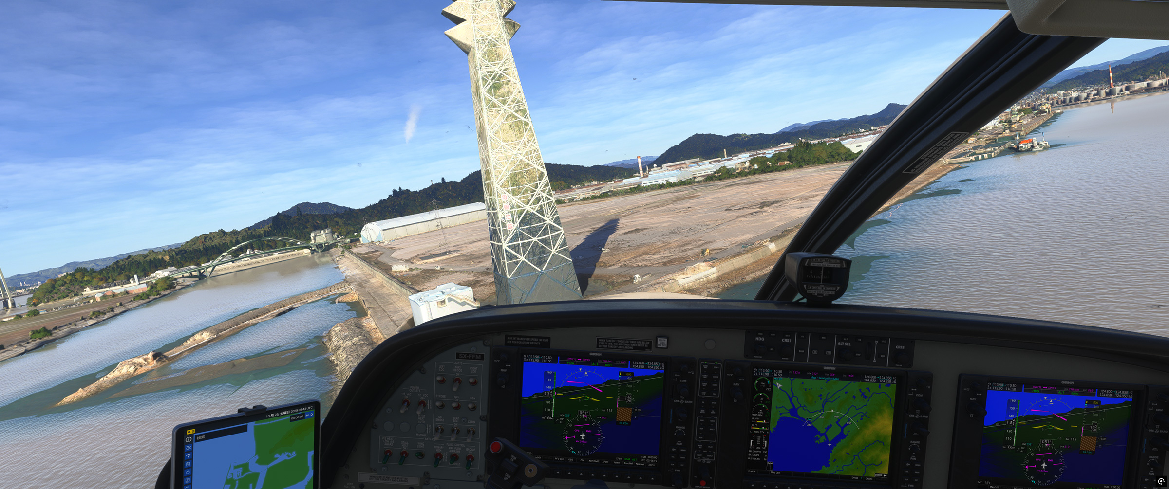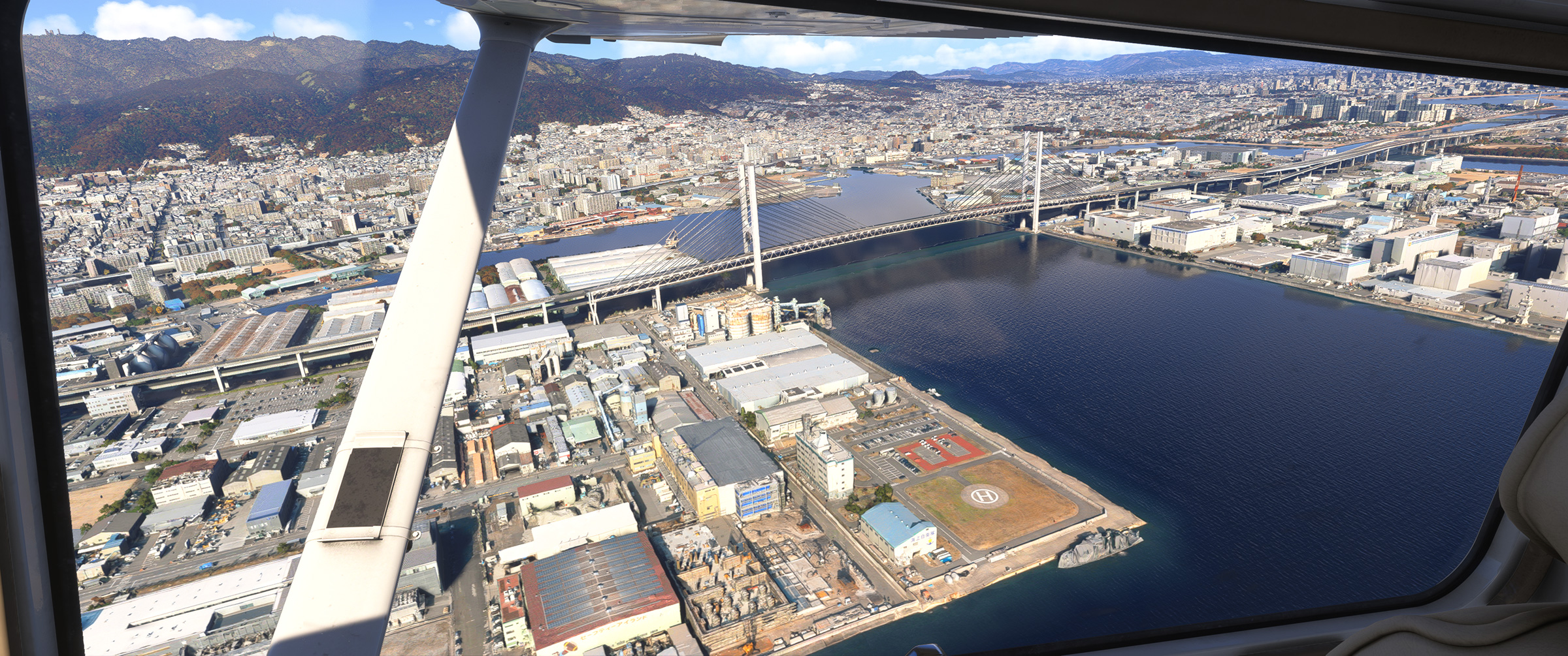 ⬆️従来はアドオンを入れなければ存在すらしなかった阪神高速湾岸線もきっちり再現され、東神戸大橋の綺麗な斜張橋も、手前の海上自衛隊阪神基地、奥の新明和工業甲南工場(US-2 の製造場所)もよく見えます。こういう景色が欲しかったんですよね☺️