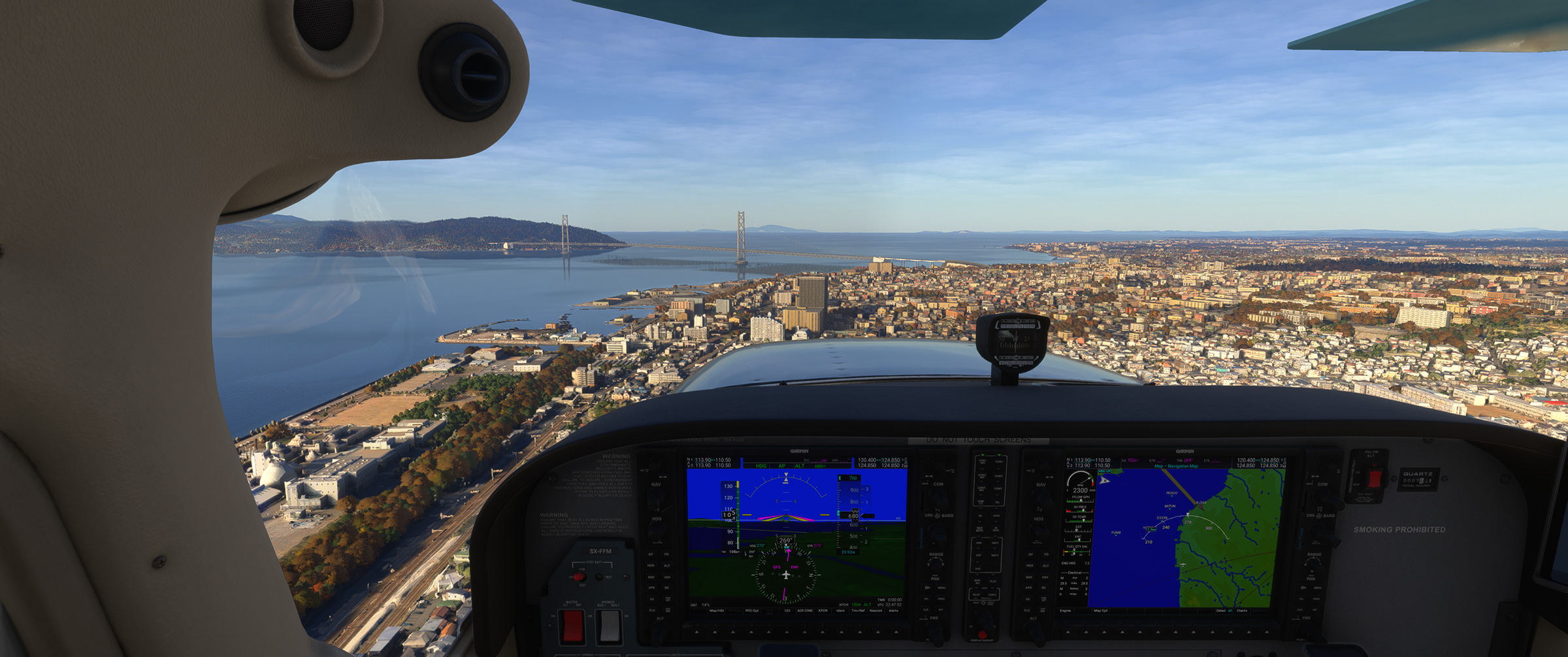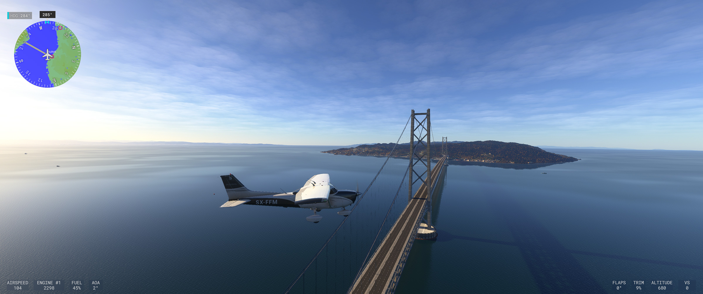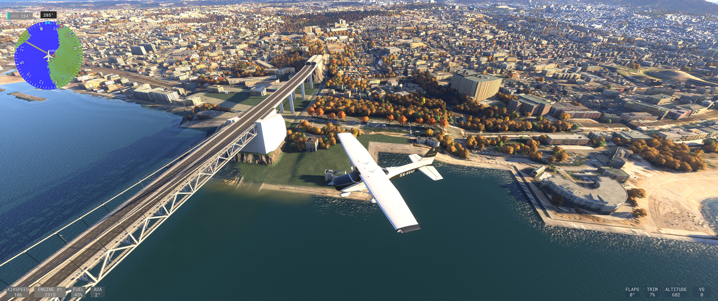 ⬆️従来はアドオンを入れなければ存在すらしなかった阪神高速湾岸線もきっちり再現され、東神戸大橋の綺麗な斜張橋も、手前の海上自衛隊阪神基地、奥の新明和工業甲南工場(US-2 の製造場所)もよく見えます。こういう景色が欲しかったんですよね☺️
