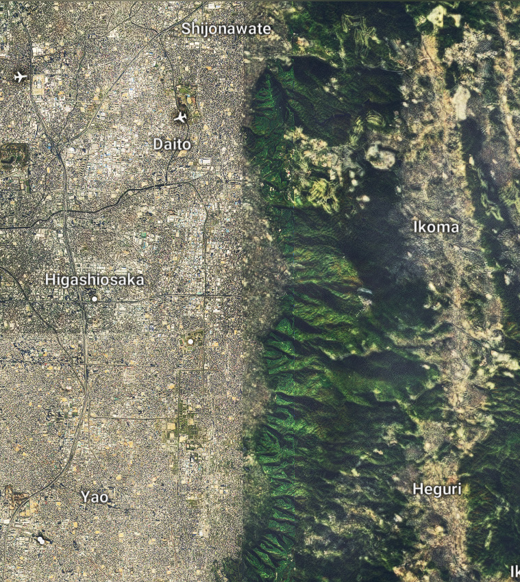先のフリーフライト画面で見た南北に引かれた境界の直線に沿って南下していくと、右手(西側、大阪市側)はフォトグラメトリ生成エリア、左手(東側、生駒山側)は従来どおりの描写の自動生成エリア、という状況が、枚方市香里園周辺から寝屋川市、四條畷市にかけて続きます。