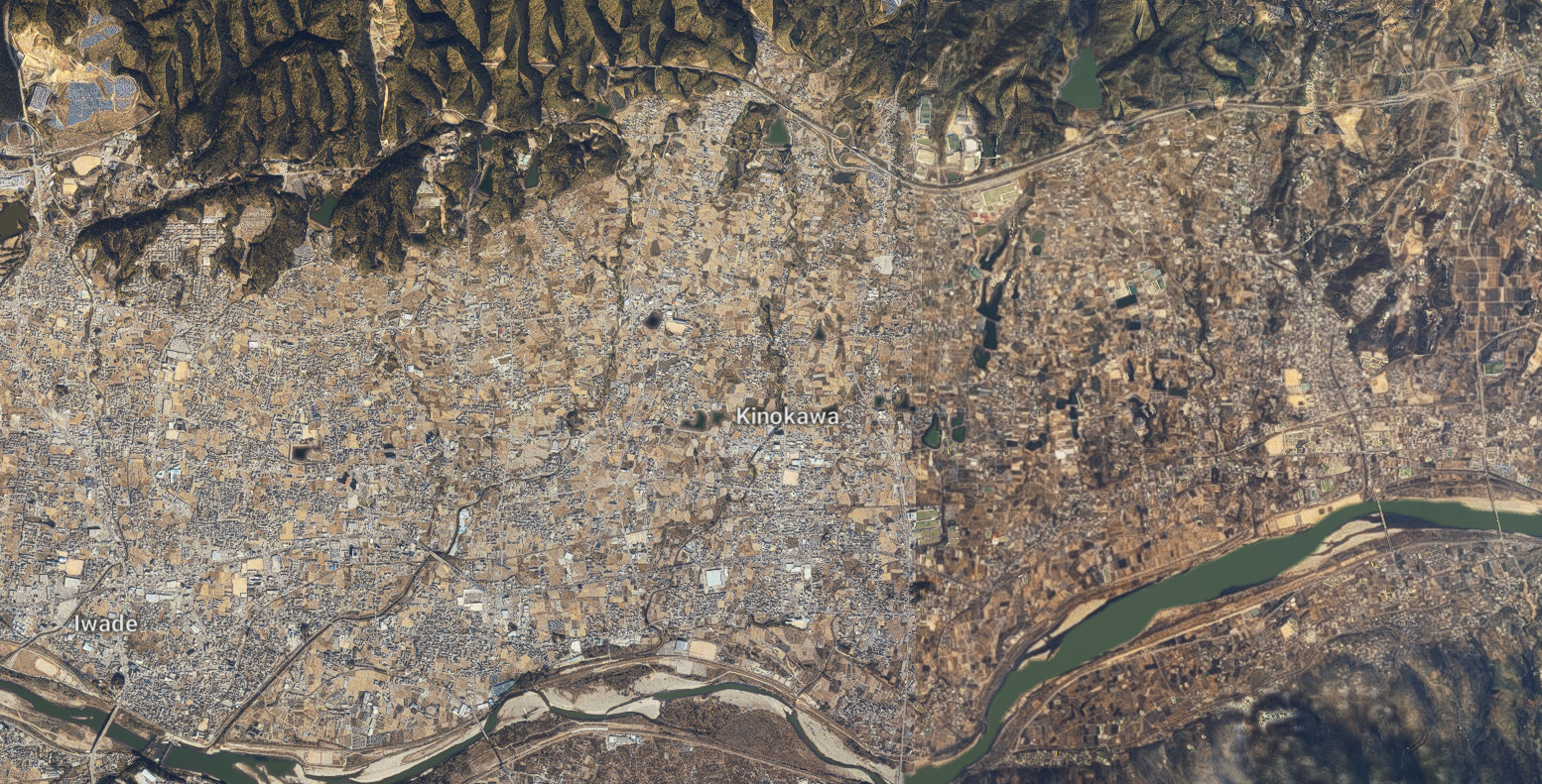 で、ふと思ったのは、大阪からずっと南下して和歌山の先の海南まで辿って調べたけれど、和歌山市内が山あいを除いて全域フォトグラメトリ生成エリアでカバーされてるなら、紀ノ川沿いの町はどこまでカバーされてるのだろうか?と。