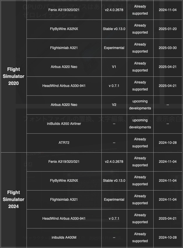 (公式対応リストの MSFS 2024 の欄に FlyByWire A32NX があるけど、FlyByWire A32NX は MSFS 2024 に公式対応していないわけで……)