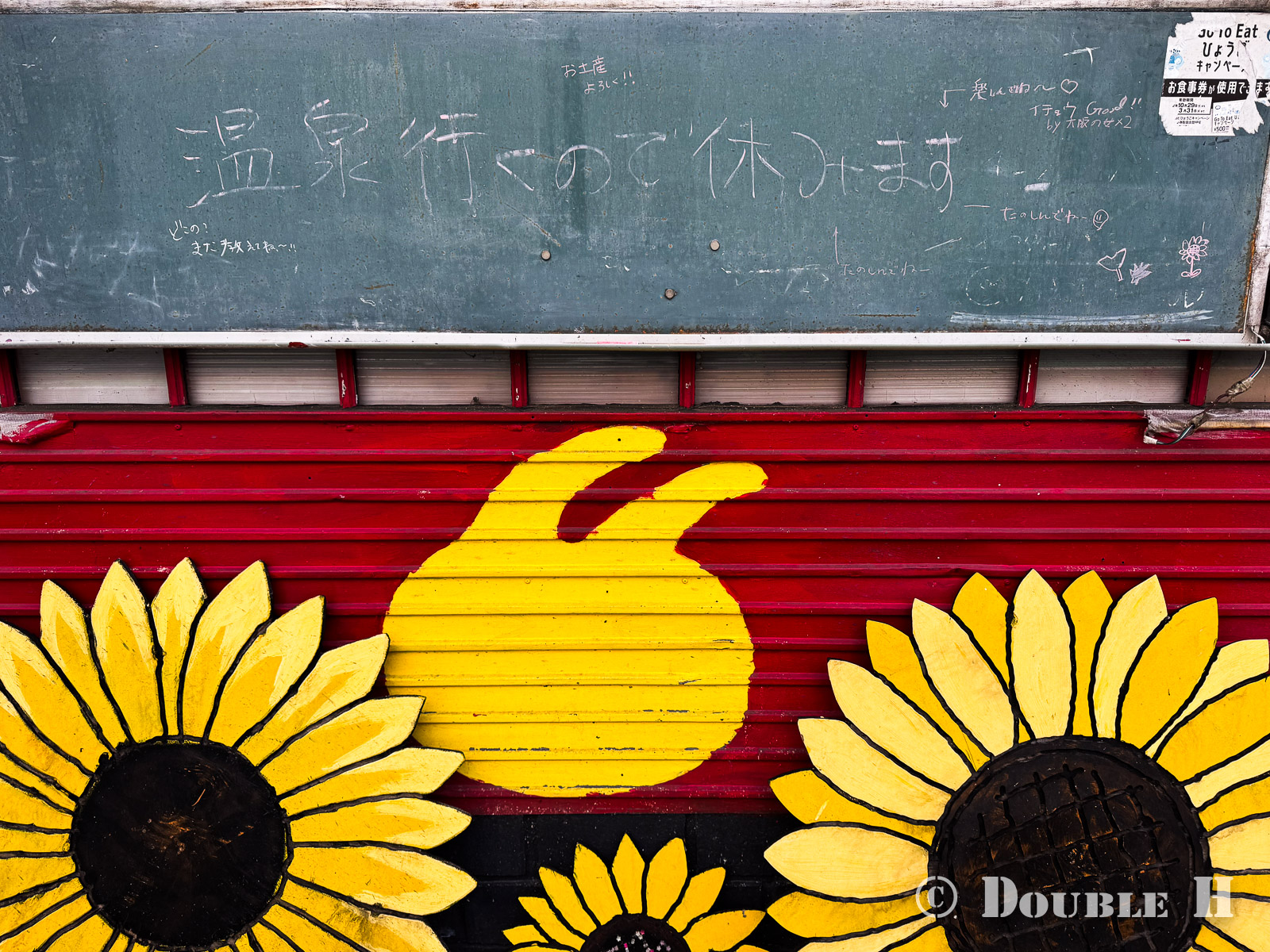 「温泉行くので休みます」 December 11, 2025 ひまわりとホルモン焼きうどんの町で、車を停めてから駅前通り?を歩いて大銀杏を見に行く途中にあった、とある店の看板。 大きなひまわりの飾りに目を惹かれたが、ふとその上の黒板を見て思わずクスッときた。古き良き田舎の町風景らしくて思わず一枚。 後から聞いた話によれば、このお店はかなり有名らしく、いま店主の方が病気療養されているからとのこと。どうりで黒板のあちこちに温かいメッセージが書かれているのだと思った。愛されているお店、マスターだということがよく分かって、改めてほっこり。 「チラシの裏な日々」カテゴリの最新記事 タグ :#看板#兵庫県#佐用町 < 前の記事次の記事 >