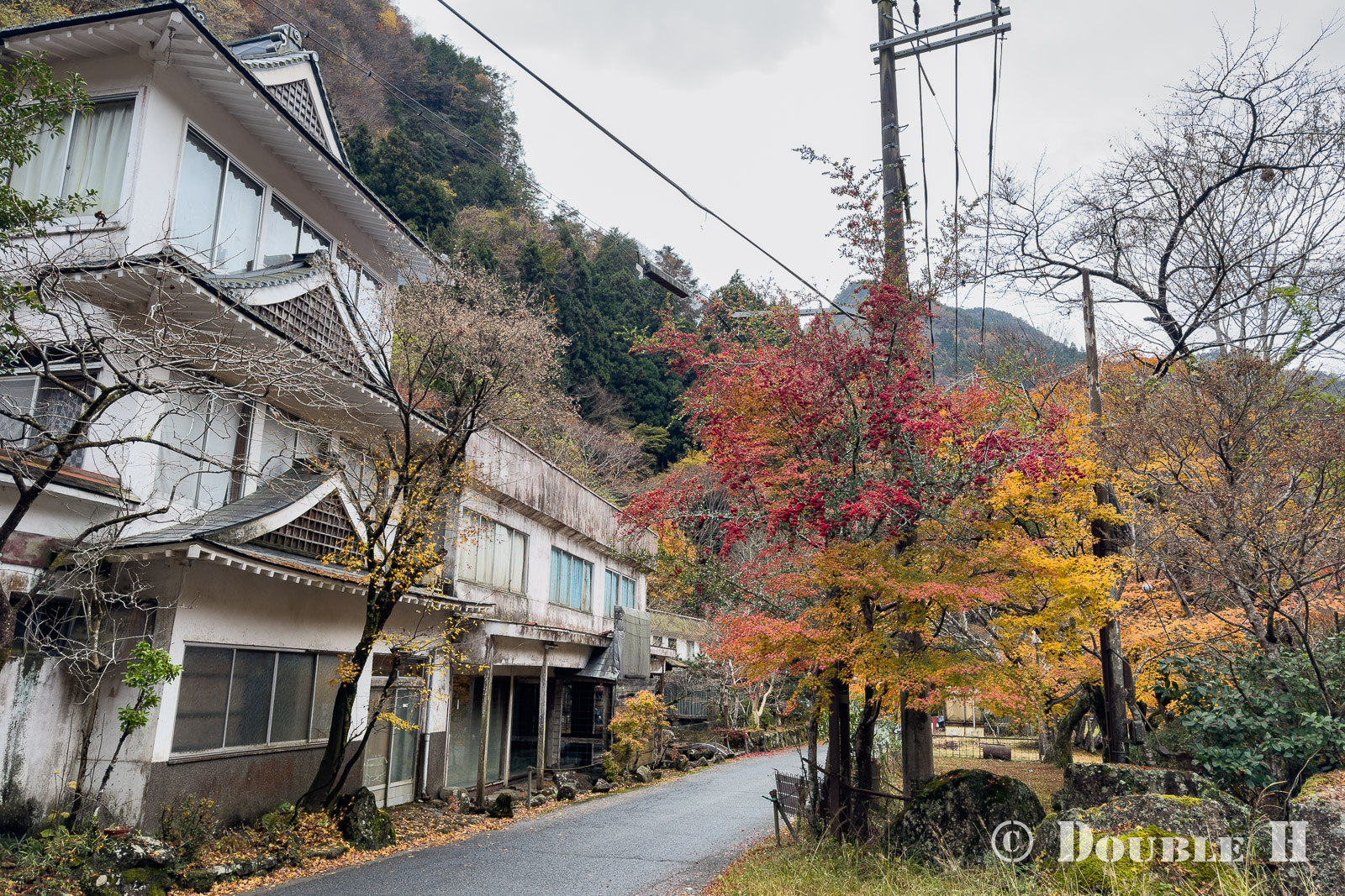 艶やかな紅葉が残っている場所は明らかに人の手で植えられた感じで、細い道路の向かいは廃業された旅館。きっと、ここの旅館の部屋の窓から印象的な紅葉と渓谷のコントラストを見られるように植えたのだろうな、と推察できる場所だった。
