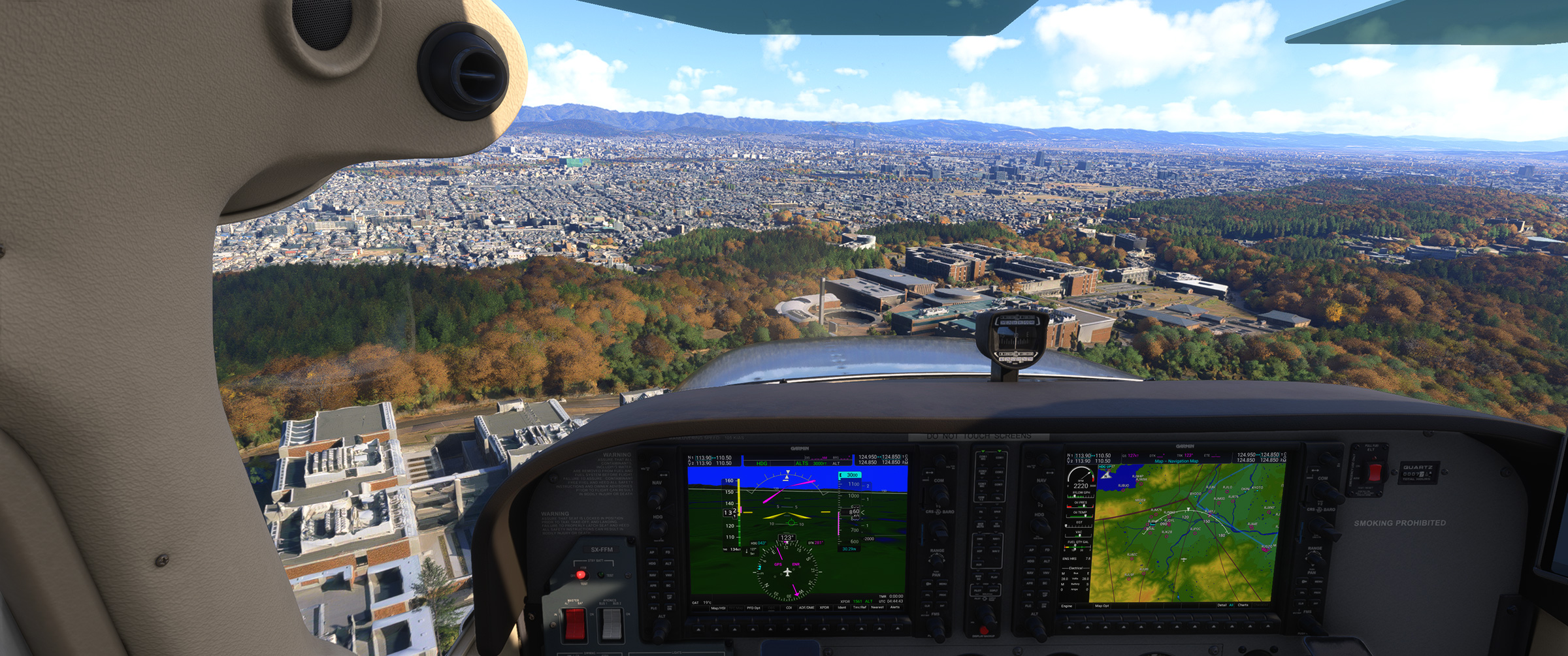 今度は個人的に使うことの多い機体で、有償アドオンのホンダジェット(アドオン商品名は HJET)の上昇中を例に、コクピット視点デフォルト位置からやや右手にある MFD (Multi Function Display) の部分を切り出して比較してみます。
