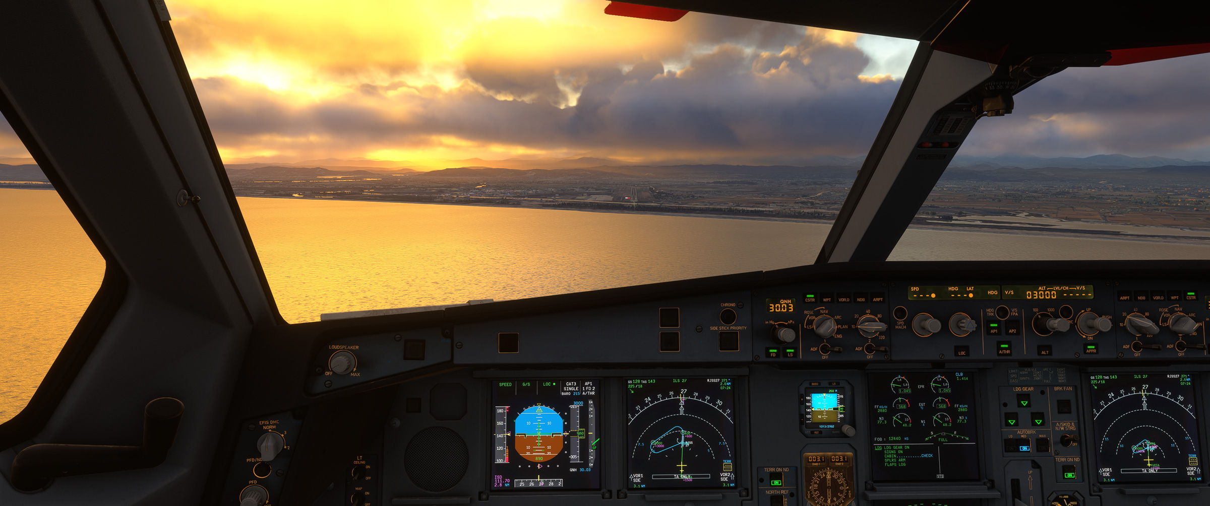 最初の例よりも随分と引いた視点になっているので計器および計器内の文字はだいぶ小さく表示され、なおかつ(メインの視界はコクピットから見る外界なので)計器がやや陰になって暗く表現されているため、計器の文字は判りづらくなっています(実際のフライト時の標準的な見た目と同じ)。