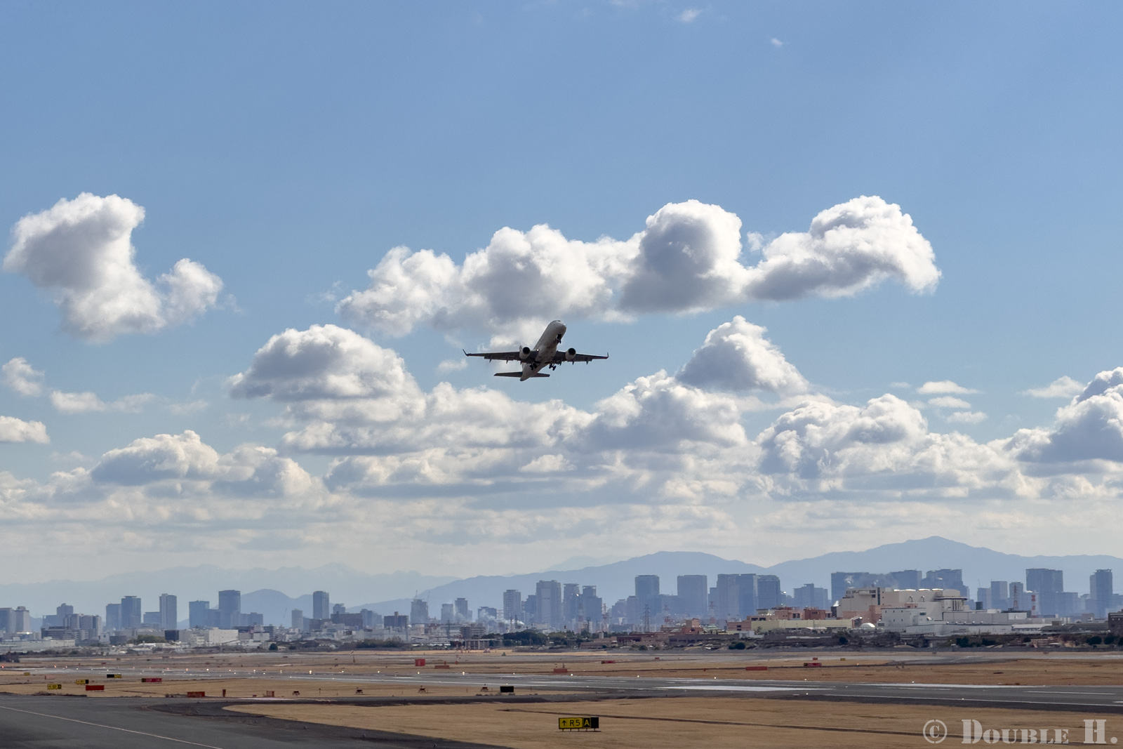 離陸位置からは距離のあるエアフロントだが、スマホカメラでも 120mm 相当の望遠があれば、梅田の高層ビル群を背景にした RWY 32R 上がりの飛行機は格好がつく。寒いけど空気が良いこの季節だからこそ、スマホカメラでも太刀打ちできるというか。