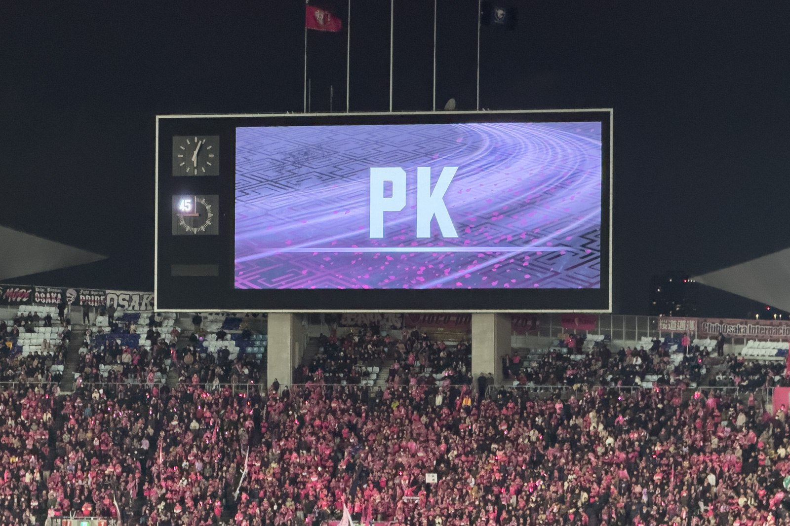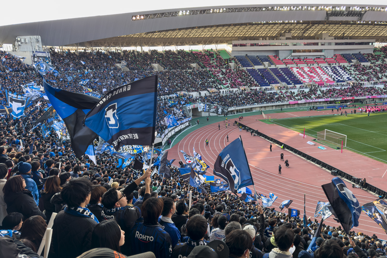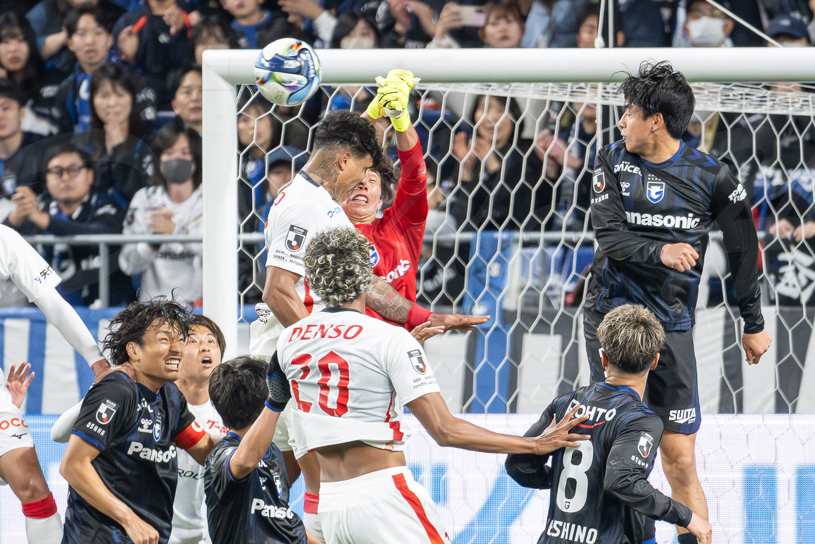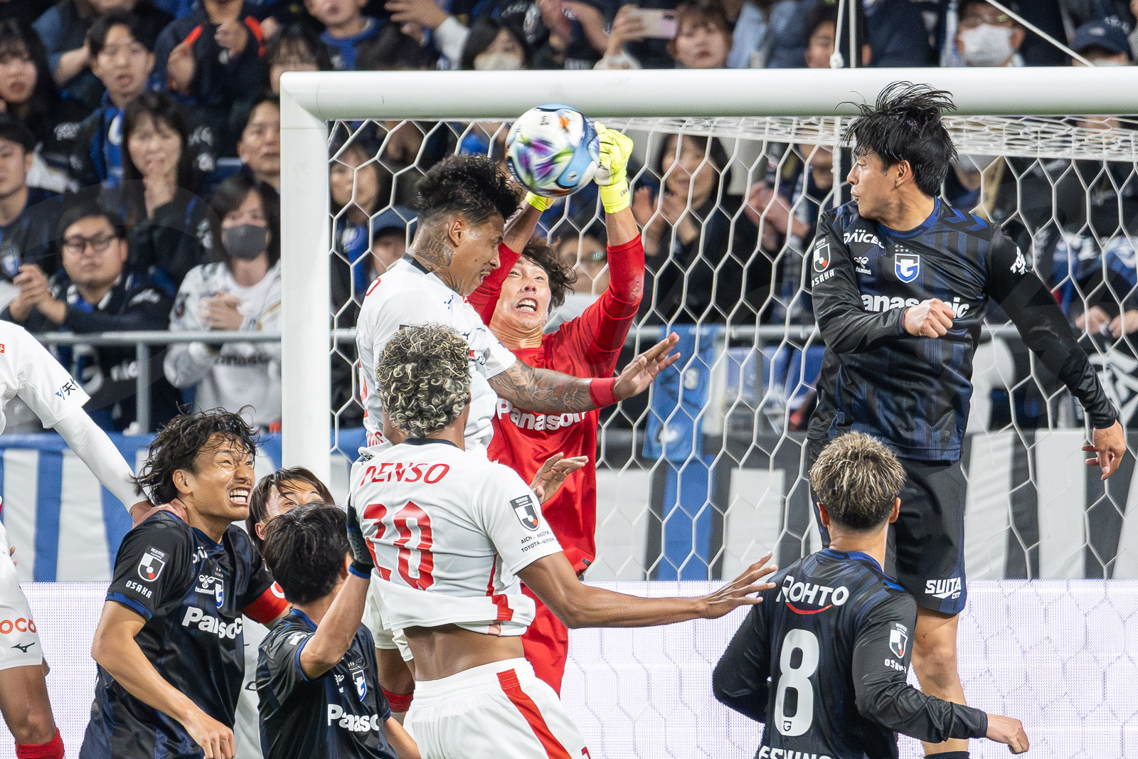 写真はアディショナルタイムも半ばが過ぎた試合終了近く、相手のコーナーキックを GK 東口順昭選手がパンチングでボールを弾いたシーン。あとから DAZN で試合を見返した時にもかなりギリギリだったと思ったが、改めて東口選手が手を伸ばしてボールを弾いてなかったらドンピシャで相手選手の頭に合っていたギリギリのところだったと確認。