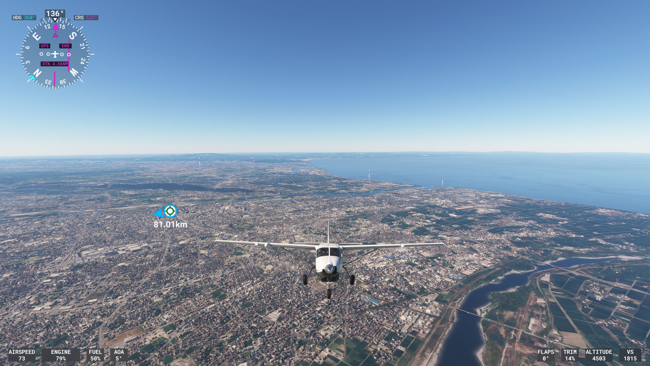 ということもあります。接近するにつれ建物が描かれていきますが、本機スペックでは色々と足りないんだなぁ…と実感させられる事例の一つですし、リアルさという点からは少々興醒めでもあります。